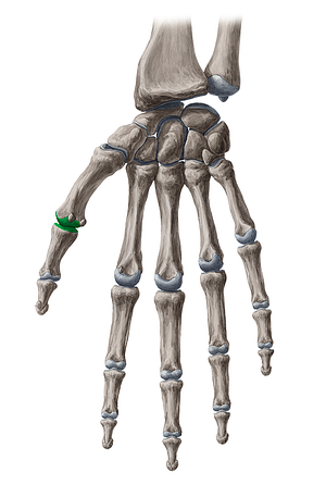 Shown from anterior perspective. Also known as Metacarpophalangeal joint of thumb.