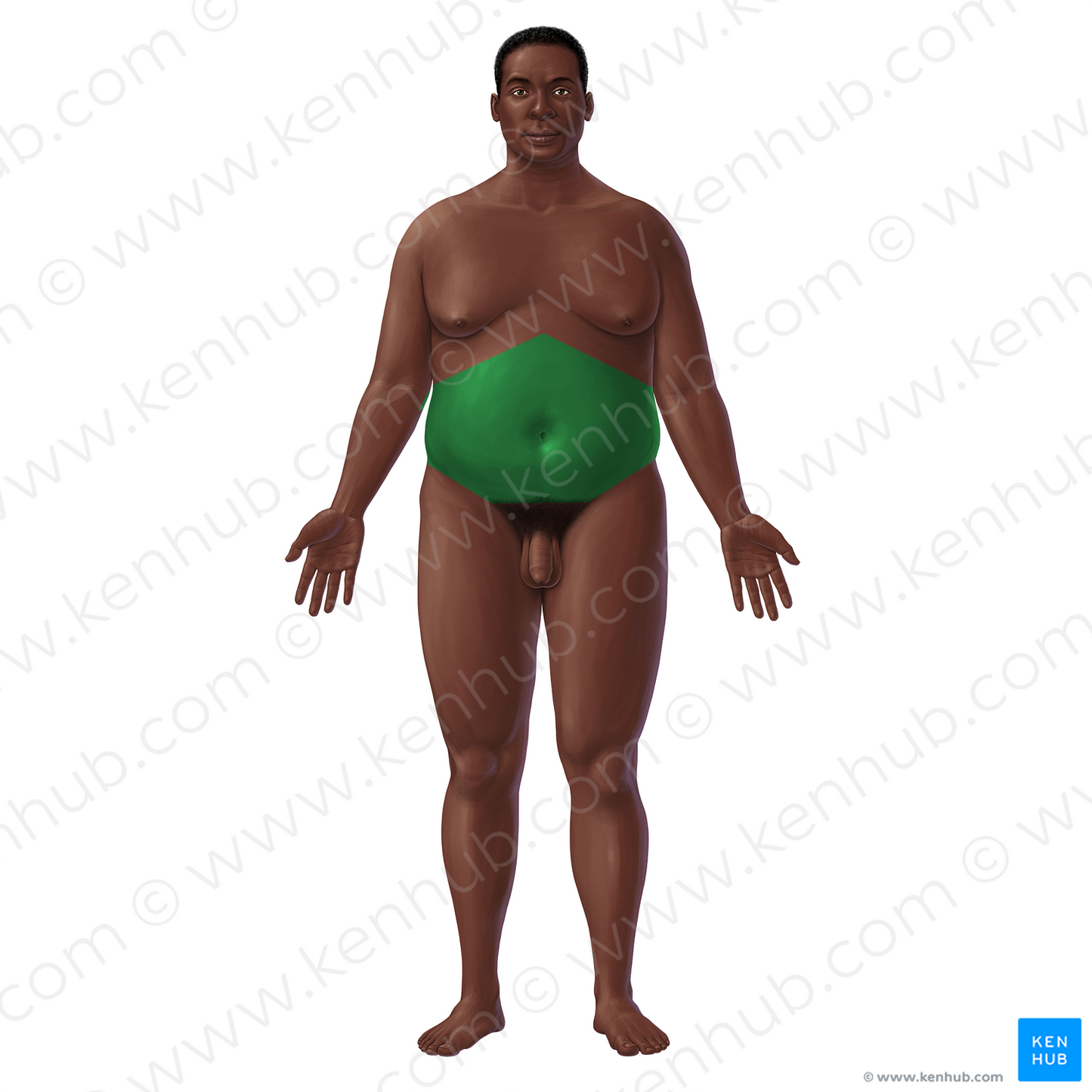 Shown from anterior perspective. Also known as Abdominal region.