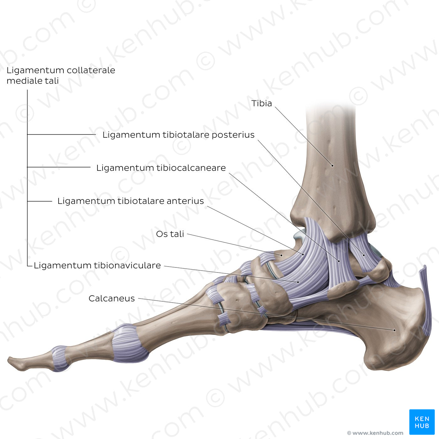 Considering its role in bearing the entire weight of the body, it is not surprising that the art. talocruralis (ankle joint) has quite a few ligaments that stabilize it during movement. The ligaments are divided into two groups: the lig. collaterale mediale and lig. collaterale laterale. The lig. collaterale mediale, also known as the lig. deltoideum, is a strong band that reinforces the medial aspect of the joint and prevents dislocations of the ankle joint. The ligament has a proximal attachment on the malleolus medialis of the tibia, and fans out from there to insert onto the os naviculare, calcaneus, and talus. Consequently, the lig. collaterale mediale consists of 4 parts: the lig. tibionaviculare, extending from the tibia to the os naviculare, the lig. calcaneotibiale stretching from the tibia to the calcaneus, and lig. talotibiale anterius and posterius, extending from the tibia to the talus.