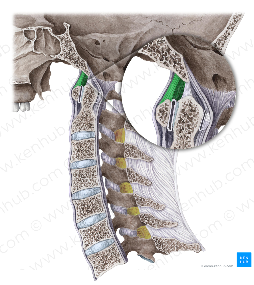 Shown from sagittal perspective. Also known as Ventral atlantooccipital ligament.