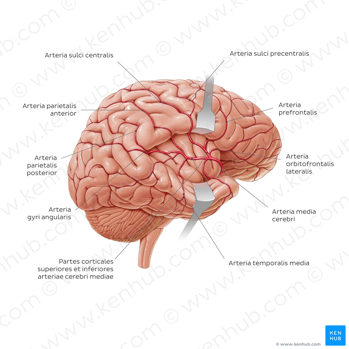 Lateral view of the brain with its arterial vessels; the sulcus lateralis has been opened to expose the arteries within. The prominent vessel seen from this view is the a. media cerebri, which is the direct continuation of the a. carotis interna. It provides a large number of small central branches (e.g. rr. centrales anterolaterales) as well as several larger rr. corticales s such as the a. orbitofrontalis lateralis, aa. insulares (not shown) as well as several additional rr. corticales temporales/frontales/parietales . The rami corticales of the a. media cerebri supply most of the lateral surface of the lobus frontalis, lobus parietalis and lobus temporalis (except for the superior border of the former two and inferior border of the latter). Smaller central branches supply the corpus striatum and capsula interna.