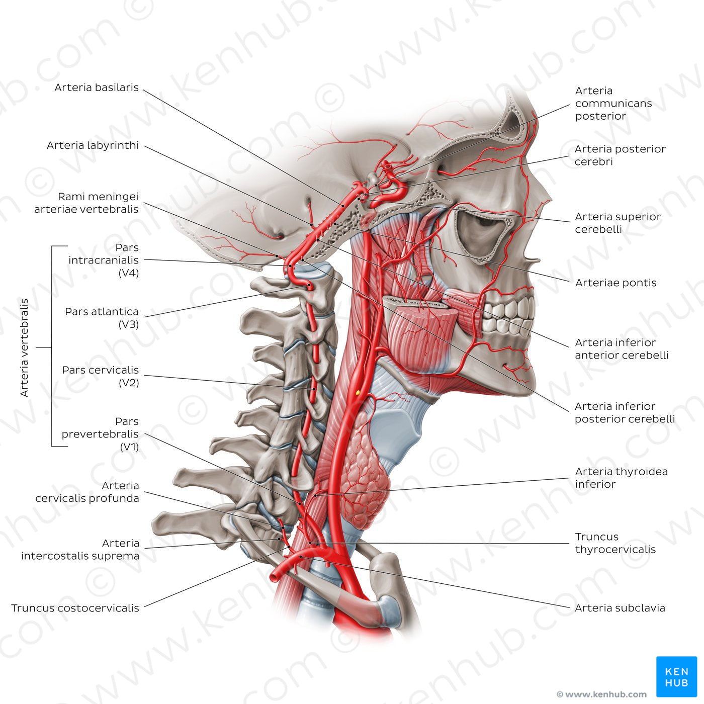 The a. vertebralis can be seen in its totality with four parts: pars prevertebralis (V1), pars cervicalis (V2), pars atlantica (V3) and pars intracranialis (V4). The most important branches originate in the pars intracranialis: rami meningei (that supply the meninges of the posterior fossa), a. inferior posterior cerebelli (a.k.a. PICA). The a. vertebralis terminates by merging with the contralateral a. vertebralis to form the a. basilaris. Some branches of the a. basilaris should also be recognized: the aa. labyrinthi and rr. pontis can be noted, as well as the a. inferior anterior cerebelli (a.k.a. AICA), the a. superior cerebelli and the aa. posteriores cerebri, which are its terminal branches.