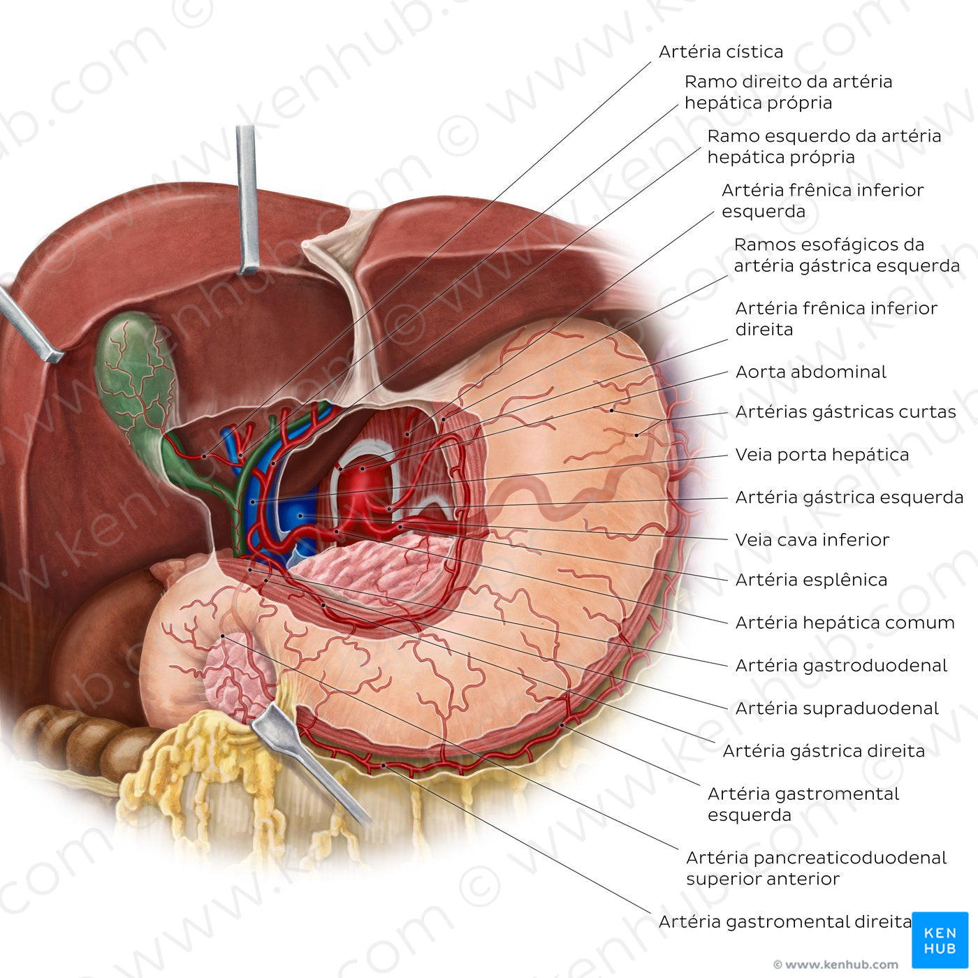 A irrigação do estômago é proveniente do tronco celíaco, sendo o sangue fornecido através de dois sistemas anastomóticos ao longo das curvaturas gástricas e por vários ramos diretos. A anastomose ao longo da curvatura menor é formada pela união das artérias gástricas direita e esquerda, que se originam da artéria hepática comum e do tronco celíaco, respectivamente. A anastomose da curvatura maior é formada pela união das artérias gastromentais (gastroepiploicas) direita e esquerda, que se originam das artérias gastroduodenal e esplênica, respectivamente. As artérias gástricas curta e posterior, que se originam da artéria esplênica, irrigam o fundo e a parede posterior do estômago. O fígado é irrigado pela artéria hepática própria, que é uma continuação da artéria hepática comum e cursa ao lado da veia porta hepática e do ducto biliar. A artéria hepática direita emite a artéria cística, que irriga a vesícula biliar.