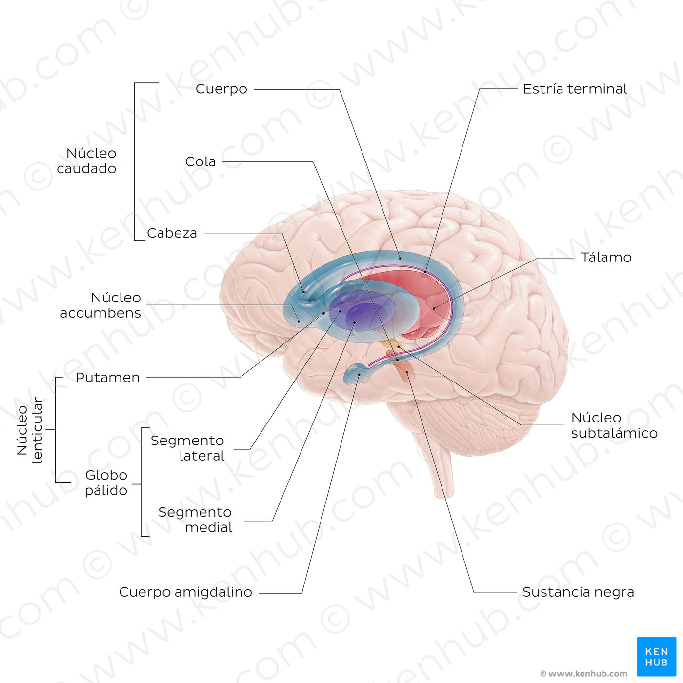 En esta perspectiva lateral izquierda del encéfalo podemos ver los diferentes núcleos izquierdos de los ganglios de la base. El núcleo caudado es una estructura alargada, en forma de C que consta de una cabeza, cuerpo y cola. La cola se extiende anteriormente tan lejos hasta la amígdala o cuerpo amigdalino, que no es parte del núcleo caudado. Ubicado cerca de la cabeza y el núcleo caudado se encuentra el núcleo accumbens, una estructura involucrada en la percepción del placer que es considerada parte del sistema límbico. Contínuo a la cabeza del núcleo caudado está el putamen, un núcleo redondeado y el más lateral de los ganglios basales. El globo pálido está ubicado medialmente al putamen y está dividido en los segmentos externo (o lateral) e interno (o medial). También representadas en esta imagen observamos dos estructuras importantes, funcionalmente relacionadas con los ganglios de la base: el núcleo subtalámico y la sustancia negra, ubicadas en el subtálamo y el mesencéfalo, respectivamente. Central en esta imagen y ubicándose medialmente a los ganglios de la base se encuentra el tálamo. El tálamo presenta conexiones importantes con los ganglios basales.