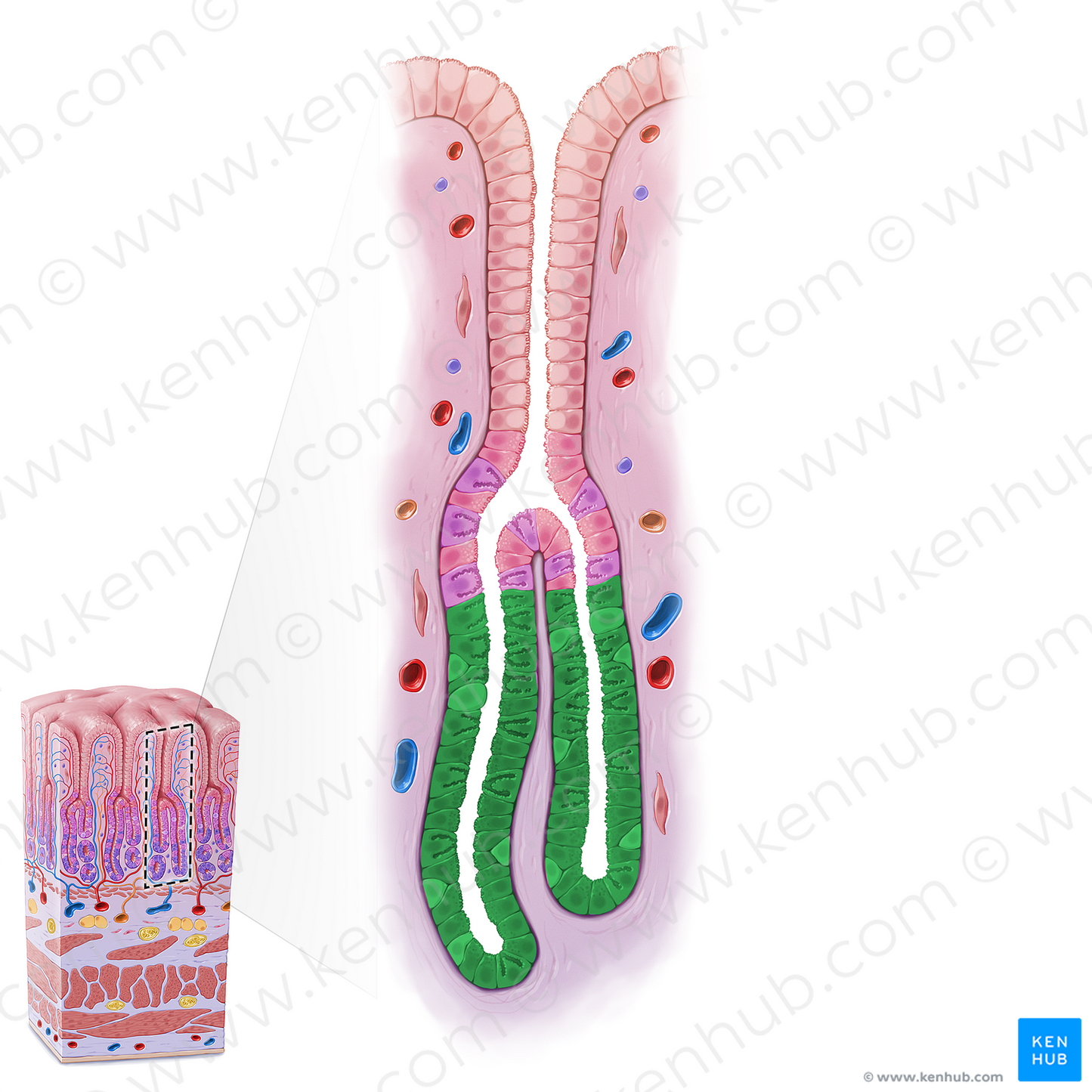 Shown from sagittal perspective. Also known as Prinicpal part of gastric gland, and Fundus of gastric gland.