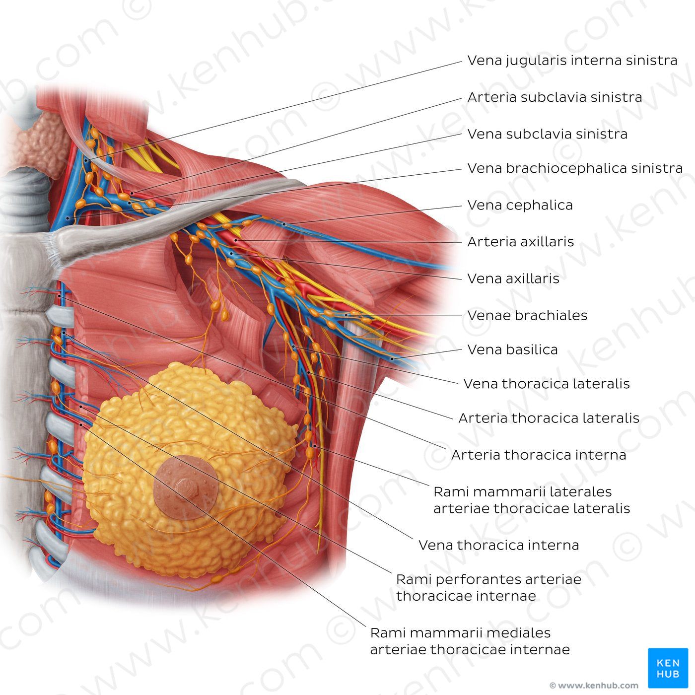 The image shows the left pectoral region of a female, with the skin removed to reveal the breast tissue. The mm. pectoralis major and minor are also reflected to better expose the blood vessels beneath them. It is possible to see the a. thoracica interna branching from the a. subclavia and running along the lateral border of the sternum. The rami perforantes arteriae thoracicae internae give off rr. mammarii mediales arteriae thoracicae internae that supply the medial aspect of the breast. The a. axillaris is a continuation of the a. subclavia originating at the lateral border of the first rib. It gives off the a. thoracica lateralis that supplies the superolateral aspect of the breast. Most of the venous drainage is carried out by tributaries of the v. axillaris (v. thoracica lateralis, v. cephalica and v. basilica). Some blood of the medial aspect of the breast is drained by the v. thoracica interna that follows the course of its corresponding artery to drain into the v. subclavia.