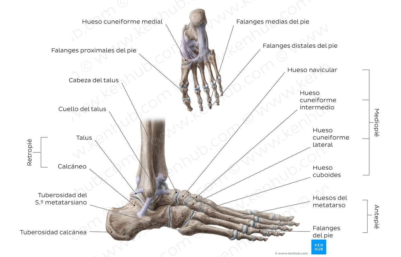 El retropié es el grupo más proximal y contiene solo dos huesos: talus y calcáneo. El talus forma la articulación talocrural superiormente con la tibia y la fíbula, mientras que el calcáneo forma el talón. Por delante del talo y calcáneo podemos ver el siguiente grupo de huesos del tarso que pertenecen al mediopié: navicular, cuboides y los tres cuneiformes (cuneiforme lateral, intermedio y medial). El último grupo de huesos conforma el antepié, e incluye a los huesos metatarsianos y las falanges de cada dedo. Existen tres grupos consecutivos de falanges para cada dedo (proximal, media y distal), excepto para el dedo gordo que contiene solo dos falanges (proximal y distal)