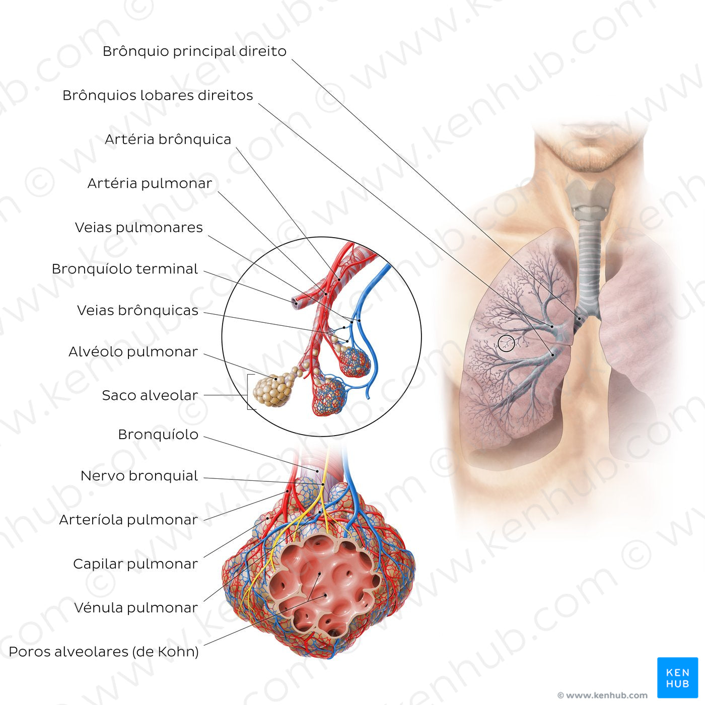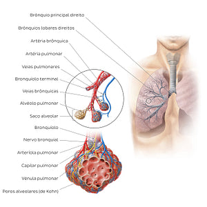 À direita, uma visão macroscópica mostra a ramificação da árvore brônquica. À esquerda, observa-se a microestrutura dos bronquíolos respiratórios, dos alvéolos e dos vasos e nervos associados. Os bronquíolos se originam dos brônquios intrassegmentares, que não possuem cartilagem e podem se dividir em até 20-25 vezes. A ultima divisão não respiratória de um bronquíolo (ou seja, que possui função somente de condução gasosa) é conhecida como bronquíolo terminal. Eles se dividem nos bronquíolos respiratórios, que se abrem nos sacos alveolares, contendo alvéolos, através de pequenos ductos alveolares. Externamente, cada saco alveolar é circundado por um ninho de capilares sanguíneos que se originam de pequenos ramos das artérias pulmonares e brônquicas.