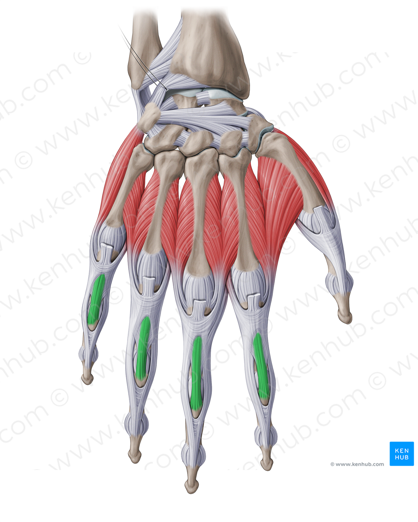 Shown from posterior perspective. Also known as Central band of extensor aponeurosis, and Central band of dorsal digital aponeurosis.