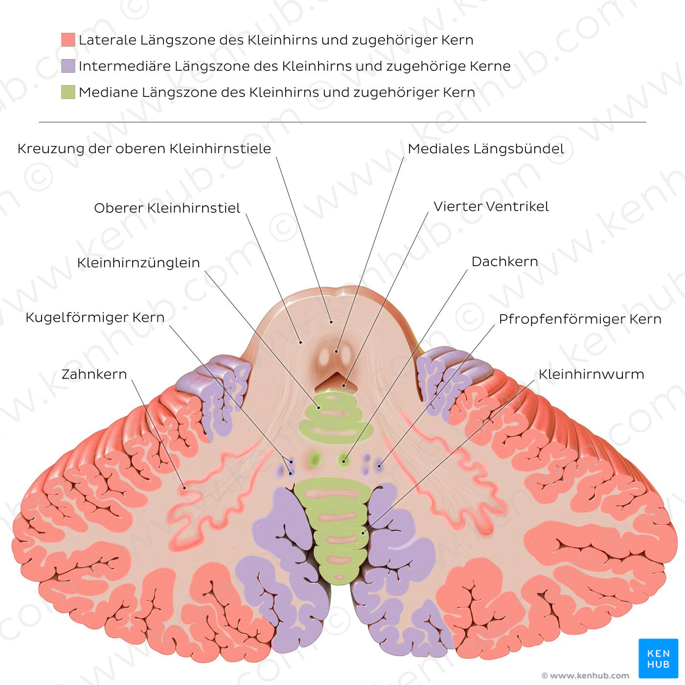 Schnitt durch den oberen Kleinhirnstiel und das Kleinhirn. Die Kleinhirnrinde ist farblich an die entsprechenden Kerne angepasst. Der am weitesten medial gelegene Kleinhirnkern ist der Dachkern (Giebelkern), der in der Nähe der Mittellinie zusammen mit dem kontralateralen Dachkern liegt. Dieser Kern ist funktionell mit der medialen Zone des Kleinhirns (Vermis) der darüberliegenden Kleinhirnrinde verbunden. Lateral vom Dachkern befinden sich der kugelförmige Kern und pfropfenförmiger Kern. Diese Kerne sind funktionell mit der intermediären Zone (Zona paravermalis) der Kleinhirnrinde verbunden. Der Zahnkern ist der größte und eindrucksvollste der Kleinhirnkerne; seine Größe entspricht der großen darüberliegenden lateralen Zone des Kleinhirns, mit der er verbunden ist. Der Zahnkern ist eine Ansammlung von grauer Substanz, die eine stark gefaltete Struktur aufweist und sich lateral vom kugelförmigen Kern und vom pfropfenförmiger Kern befindet. Seine Öffnung, Hilum des Zahnkerns, ist nach anteromedial zum oberen Kleinhirnstiel orientiert, zu dem seine efferenten Fasern ziehen. Er kann weiter in eine Pars dorsalis/motoria/microgryia und Pars ventralis/nonmotoria/macrogyria unterteilt werden, die eine wichtige Rolle in der Modulation der Willkürmotorik bzw. der kognitiven Prozesse und visuell-räumlichen Orientierung spielen.