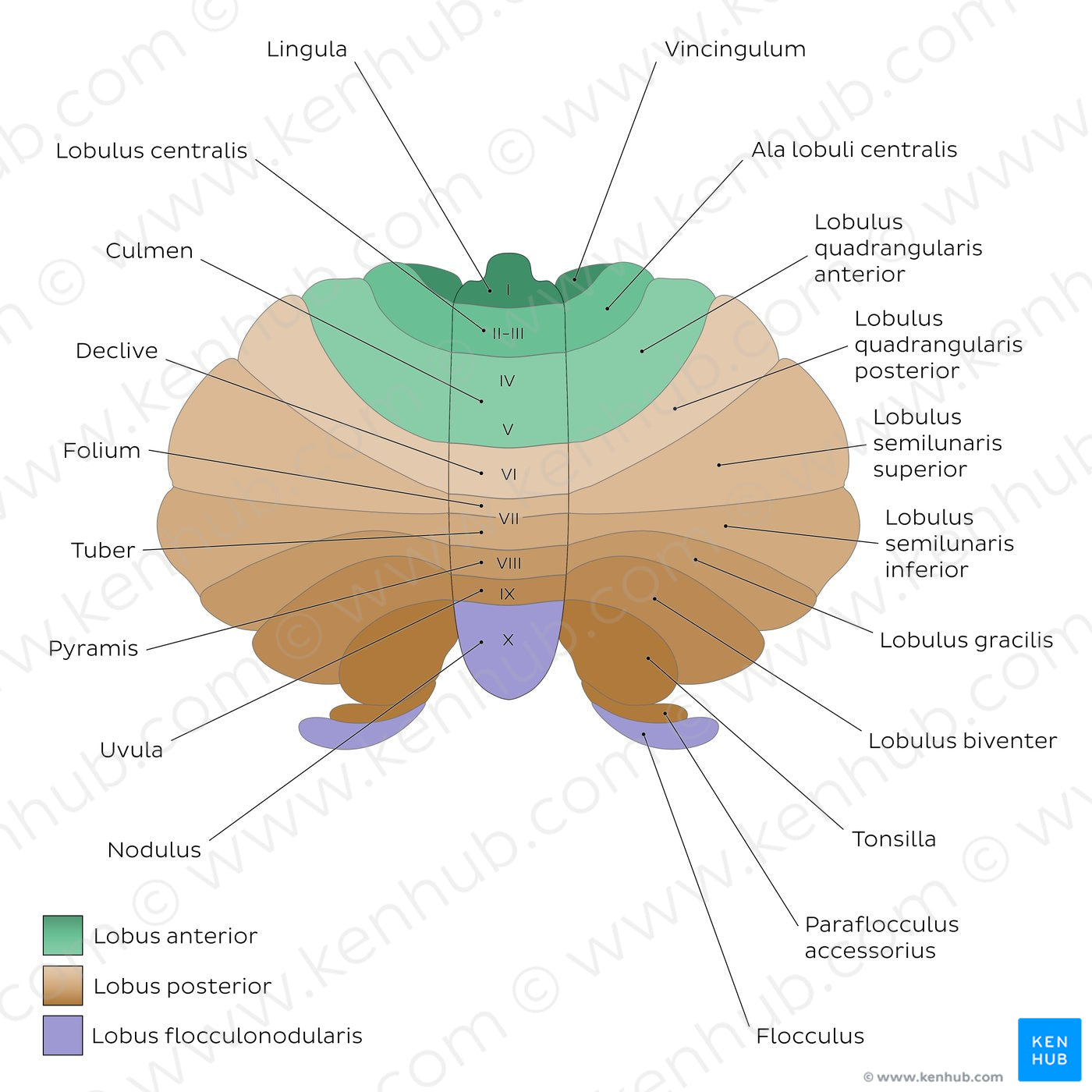 Simplified, ‘unrolled’ representation of cerebellar anatomy with the vermis cerebelli located in the midline, separating the bilateral hemispheria cerebelli. The cerebellum is composed of three lobi (lobus anterior/posterior/flocculonodularis); with the vermis and hemispheria subdivided into ten lobuli (sing. = lobulus). The lobuli vermis are designated as I-X, while those of the lobuli hemispherii are designated as HI-HX. The pars anterior vermis comprises the lingula (lobule I), lobulus centralis (II & III) and culmen (IV & V). The pars posterior vermis is composed of five lobuli: the declive (VI), folium (VIIA), tuber (VIIB), pyramis (VIII) and uvula (IX). The pars flocculonodularis vermis is the nodulus (lobule X).The pars anterior hemispherii cerebelli consists of the vincingulum (HI a.k.a. ala lingulae), ala lobuli centralis (HII & HIII) and lobulus quadrangularis anterior (HIV & HV), while the pars posterior comprises the lobulus quadrangularis posterior (HVI, a.k.a. lobulus simplex), lobuli semilunares superior et inferior (HVIIA, a.k.a. lobus ansiformis), lobulus gracilis (HVIIB), lobulus biventralis (HVIII) and tonsilla cerebelli (HIX). The flocculus [of the lobus flocculonodularis] forms the tenth lobulus cerebelli (HX).