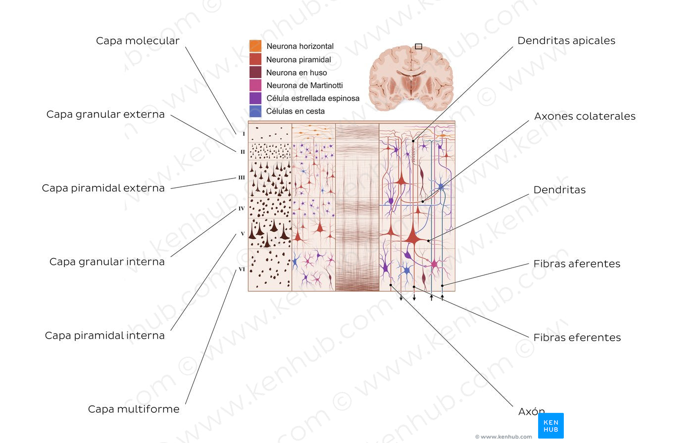 Las seis capas de la corteza cerebral son: Capa molecular, capa granular externa, capa piramidal externa, capa granular interna, capa piramidal interna y capa multiforme