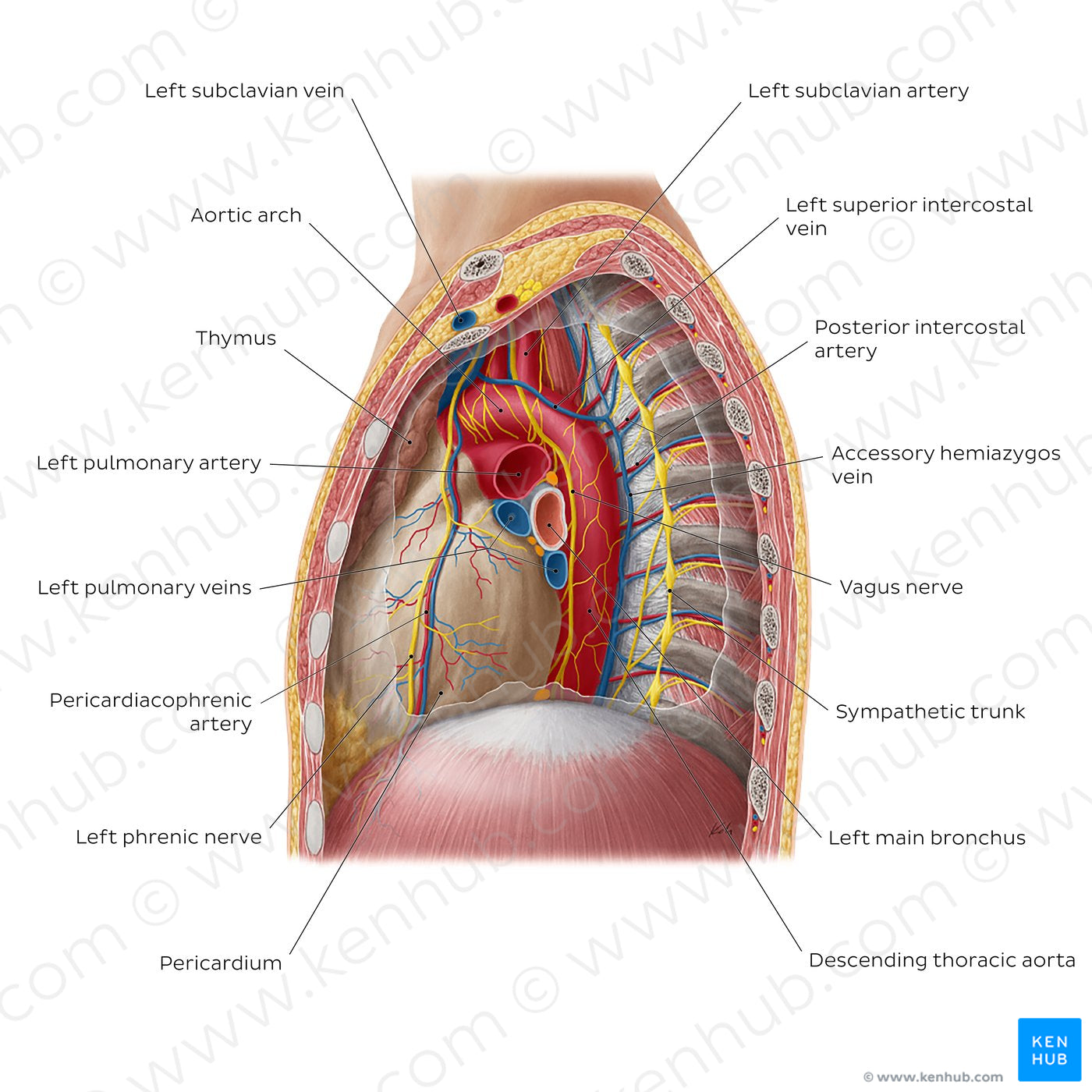 The main structures seen in this image are the thoracic aorta (situated anterolateral to the thoracic vertebral bodies and posterior to the pulmonary artery and veins), the left main bronchus as well as the pericardial sac and its contents. The phrenic and vagus nerves are also shown.
