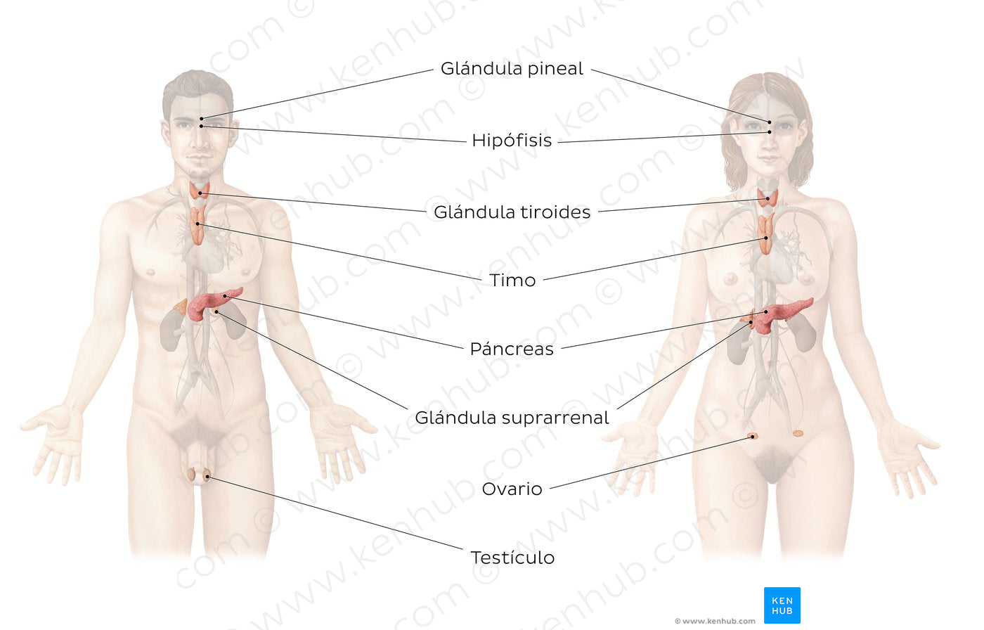 El sistema endocrino está compuesto por glándulas endocrinas que se encuentran a lo largo del cuerpo. Las principales glándulas endocrinas incluyen la glándula pineal, la hipófisis, glándula tiroides, glándula paratiroides (no visualizada en esta imagen), timo, páncreas, glándulas suprarrenales, ovarios y testículos. Cada una de estas glándulas secretan hormonas que están a cargo de funciones específicas del cuerpo.