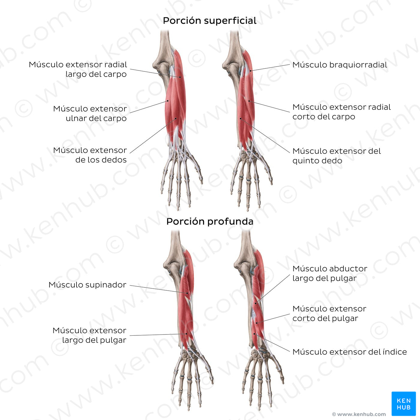 Los músculos del antebrazo se dividen en grupos/porciones superficial y profunda. El grupo superficial es un grupo de 6 músculos, que contiene los músculos braquiorradial, extensor radial largo del carpo, extensor radial corto del carpo, extensor de los dedos, extensor del meñique y extensor ulnar del carpo. El grupo profundo es un grupo de 5 músculos, que incluye al músculo supinador, abductor largo del pulgar, extensor corto del pulgar, extensor largo del pulgar y extensor del índice.