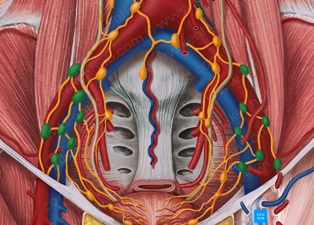 Shown from anterior perspective. Also known as Anterior iliac lymph nodes, and Inferior iliac lymph nodes.