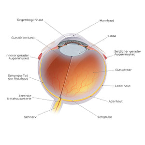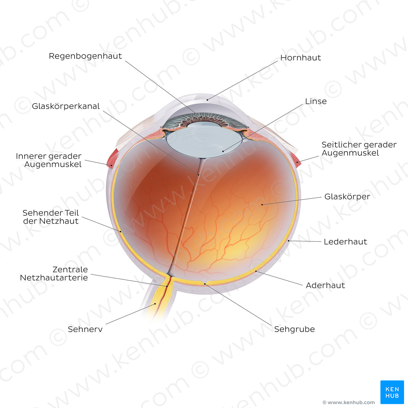 Die Aderhaut des Auges liegt zwischen der Lederhaut und der Netzhaut. Sie besteht aus vielen Gefäßbündeln, die den äußeren Teil der Netzhaut versorgen. Posterior zur Regenbogenhaut und dem vorderen Teil der Lederhaut befindet sich der Ziliarkörper, eine Verdickung aus Muskel- und Bindegewebe. Ein weiterer Bestandteil der mittleren Augenhaut ist die pigmentierte Regenbogenhaut, die eine zentrale Öffnung aufweist, welche als Pupille bezeichnet wird. Die Netzhaut bildet die innere Schicht des Auges und besteht aus einem blinden und einem sehenden Anteil. Posterior zur Linse und umgeben von der Netzhaut ist die hinterste Augenkammer mit dem Glaskörper, einer halbfesten, geleeartigen Struktur. Innerhalb der Masche des Glaskörpers befindet sich eine flüssige Substanz, die als Glaskörperflüssigkeit bezeichnet wird. Zusammen sind diese Strukturen wichtig für die strukturelle Stabilität der Linse im vorderen Auge und ermöglichen die Passage von Lichtstrahlen durch das Auge zur Netzhaut.