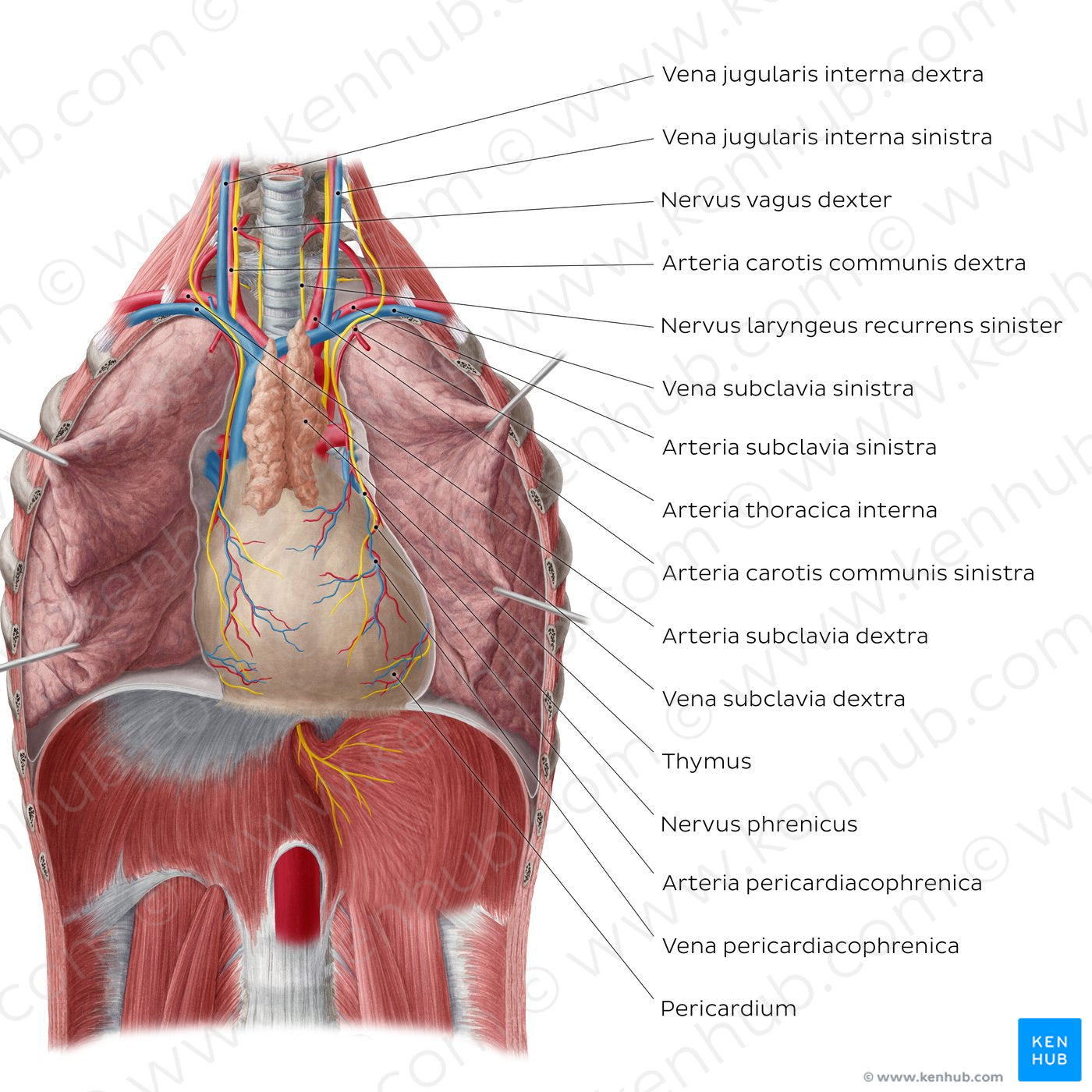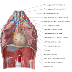 The heart (cor) is separated from other structures of the mediastinum by a double layeres fibroserous called called the pericardium. On its surface are important vessels which supply and drain the pericardium and diaphragm, known as the a./v. pericardiacophrenica. The right and left nn. phrenici, which innervate the diaphragma, course laterally on either side of the heart; these are clinically important since they can be damaged during surgical interventions to the heart.