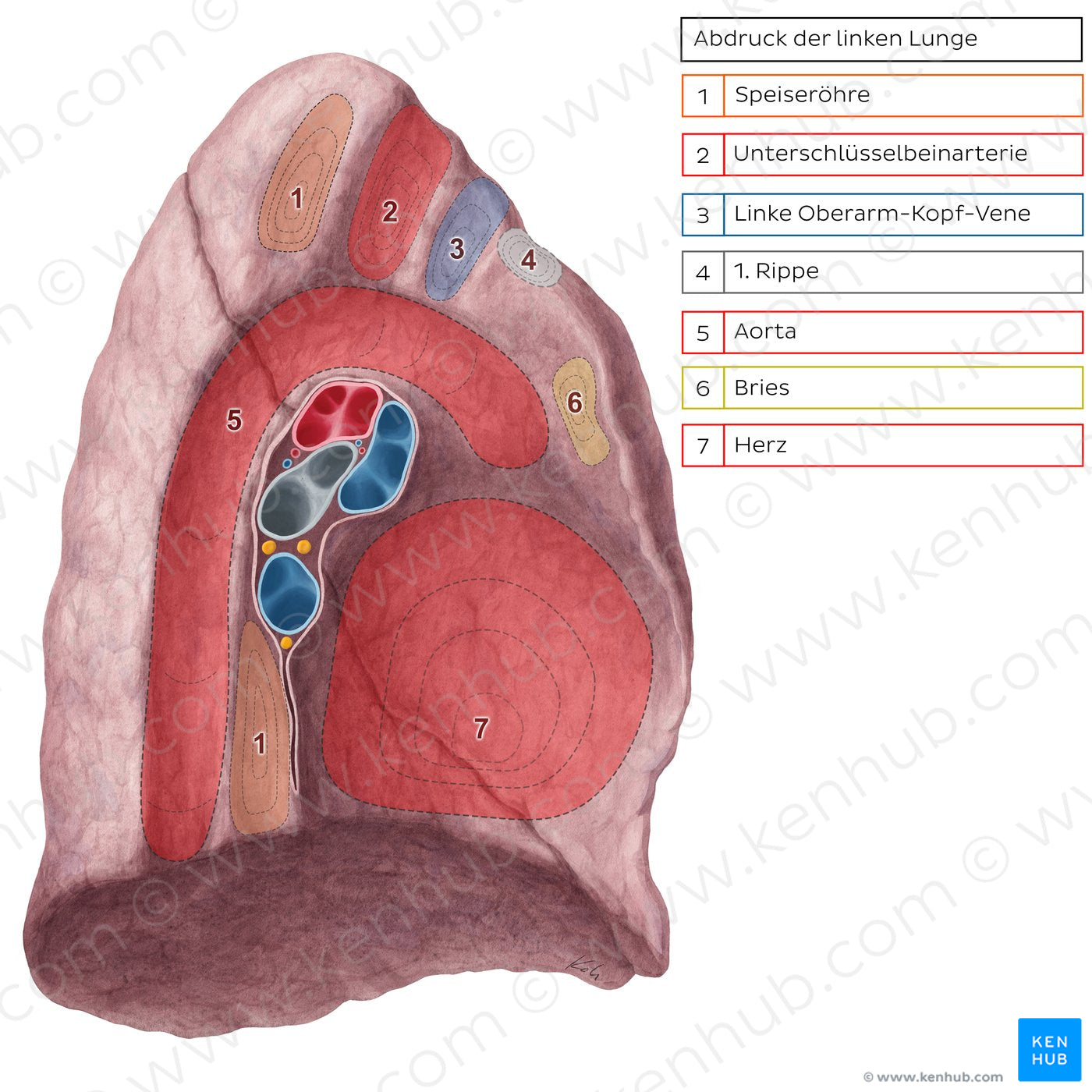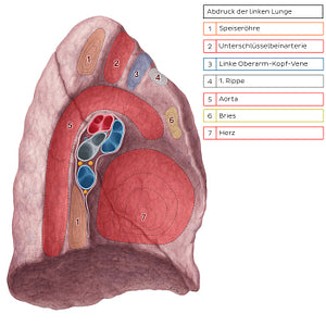 Der markanteste Abdruck auf der medialen Oberfläche der linken Lunge ist der Herzabdruck. Zu den kleineren Abdrücken gehören die der Aorta, der Unterschlüsselbeinarterie, der 1. Rippe, der Speiseröhre und der linken Oberarm-Kopf-Vene.