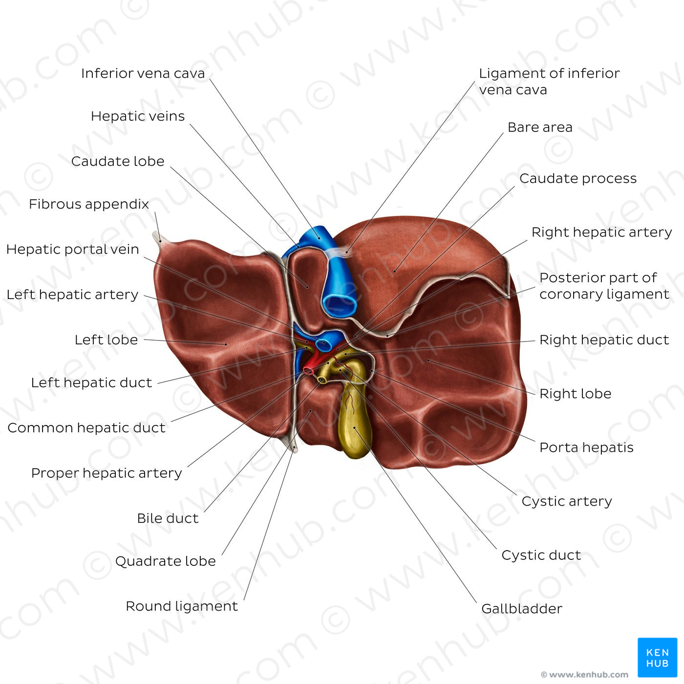 Several vascular and ligamentous structures, together with the gallbladder, form the shape of the letter H on the posteroinferior aspect of the liver. The horizontal limb is represented by the hilum of the liver (porta hepatis), which gives passage to the hepatic portal vein, proper hepatic artery and biliary ducts. The right limb of the H is formed by the groove for inferior vena cava and gallbladder below it. The left limb, which separates the left lobe from the caudate and quadrate lobes, is defined by the fissures for ligamentum venosum and round ligament. Between the porta hepatis and inferior vena cava is the posterior part of the coronary ligament that extends to the right, marking the inferior boundary of the bare area of the liver. Below it on the right lobe are impressions of the suprarenal gland, kidney and hepatic flexure of the colon. The posteroinferior aspect of the left lobe presents a well defined impression of the stomach, while the quadrate lobe is adjacent to the first part of the duodenum.