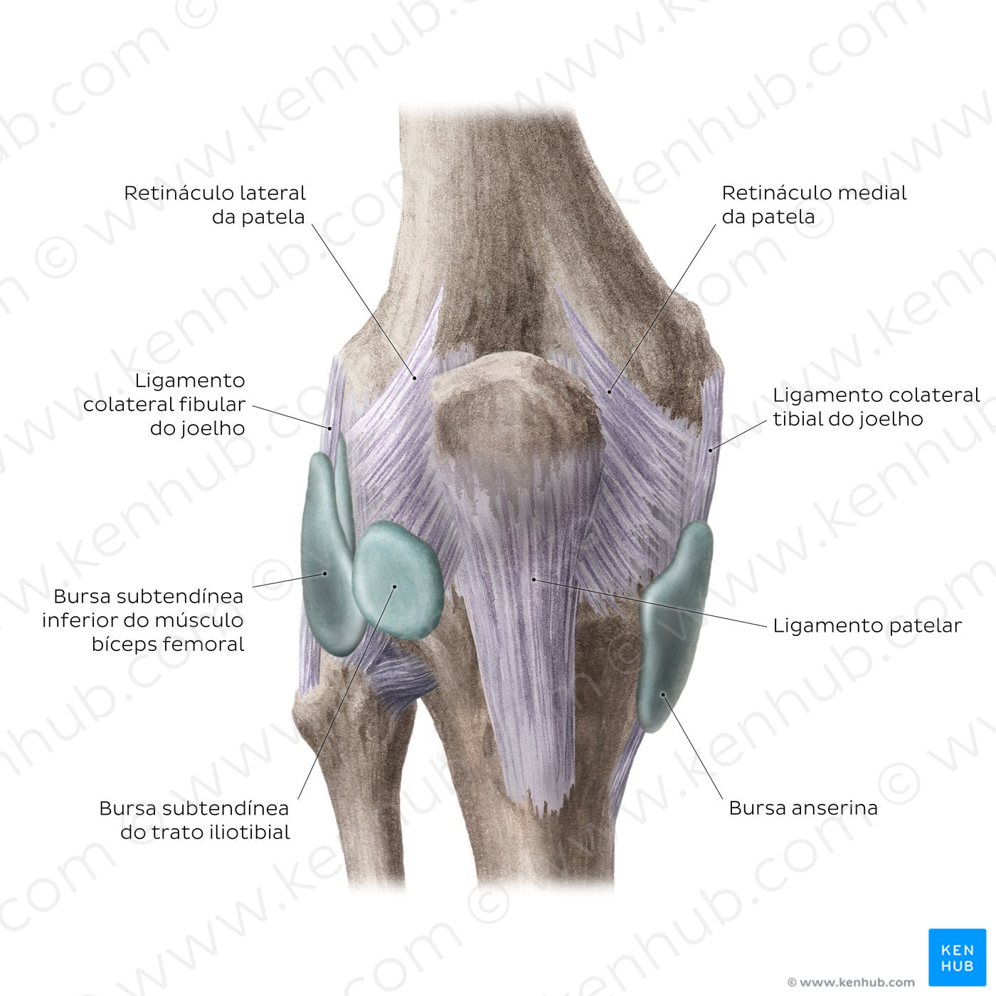 Knee joint: Bursae and extracapsular ligaments (anterior view) (Portuguese)