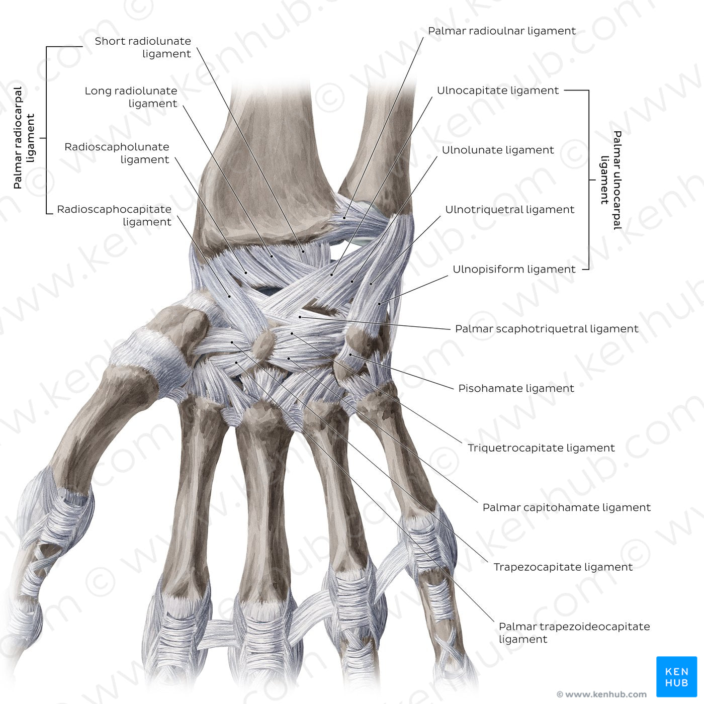 The radiocarpal joint (wrist joint) is stabilized by a number of ligaments, namely the palmar and dorsal radiocarpal ligaments, the palmar ulnocarpal ligament and the radial and ulnar collateral ligaments. These ligaments extend from the distal portion of either the radius or ulna, respectively, to insert onto the carpal bones of the hand. The intercarpal joints formed between the carpal bones are stabilized by numerous sets of ligaments. The palmar intercarpal ligaments stretch between adjacent carpal bones and are made up of the radiate carpal ligament, the palmar scaphotriquetral and pisohamate ligaments as well as a few others which are not visible from this view. The radiate carpal ligament is formed by a set of five ligaments: the scaphocapitate (not seen), triquetrocapitate, palmar capitohamate, palmar trapezoideocapitate and trapezocapitate ligaments.