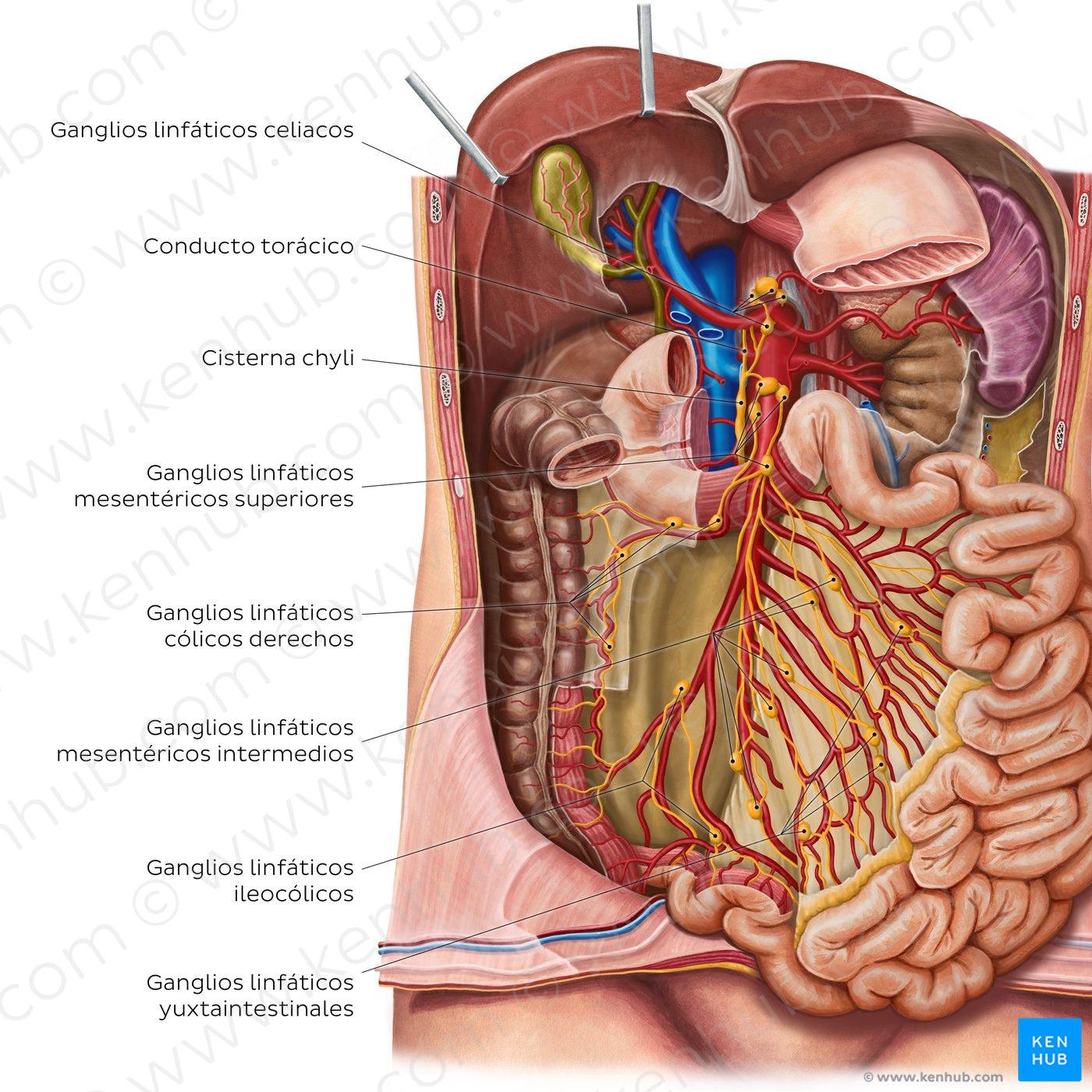 Vista general del abdomen. El hígado, estómago, páncreas y partes del intestino grueso han sido removidos. Los ganglios linfáticos del intestino delgado comprenden uno de los grupos más grandes del cuerpo, consistiendo en unos 100-150 ganglios linfáticos dispersos a través del mesenterio. Los ganglios linfáticos yuxtaintestinales se localizan cercanos y periféricos a las paredes del íleon y del yeyuno. Desde aquí, la linfa se transporta hacia los ganglios linfáticos mesentéricos superiores mediante los ganglios linfáticos mesentéricos intermedios, que se encuentran a lo largo de las arterias yeyunales e ileales. Los ganglios linfáticos pancreatoduodenales drenan la mayor parte del duodeno. La linfa es entonces transportada a los ganglios linfáticos celíacos y mesentéricos superiores antes de llegar hasta la cisterna del quilo para continuar hacia el conducto torácico.