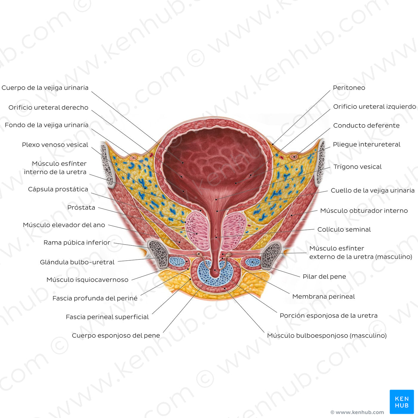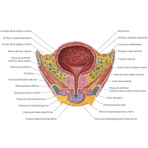 Este corte muestra el cuerpo, fondo y cuello de la vejiga. Son visibles varias características internas de la vejiga urinaria, como el trígono, los orificios ureterales izquierdo y derecho, el pliegue interuretral y la úvula de la vejiga urinaria. El cuello de la vejiga urinaria masculina se encuentra por encima de la próstata y se extiende en su parénquima como la uretra.