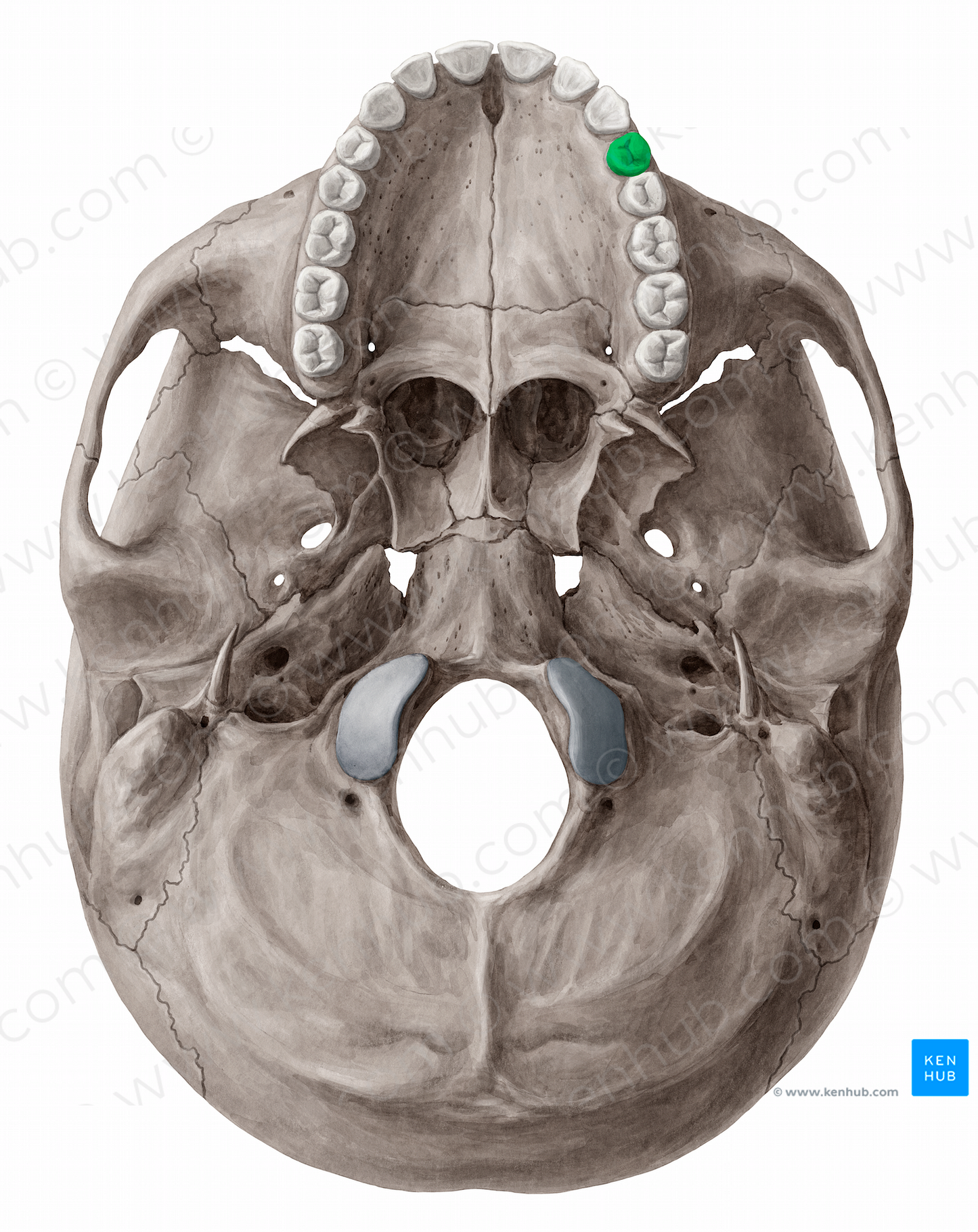 Shown from inferior perspective. Also known as Universal: 12, FDI: 24, Palmer: ⎿4, Alphanum: UL4, and Superior left first premolar tooth.