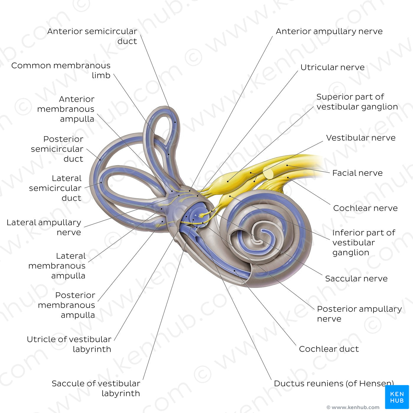 The membranous labyrinth is suspended within the perilymph of the bony labyrinth thus mirroring its overall structure. The central part of the membranous labyrinth is located within the bony vestibule. It consists of two sacs: utricle and saccule, which communicate via a small duct called the ductus reuniens. The utricle lies in the posterior part of the vestibule, while the saccule lies anteriorly. The three membranous semicircular ducts branch from the utricle and pass through the semicircular canals. Similar to their bony counterparts, the canals originate with membranous ampullae (anterior, posterior, lateral). The anterior and posterior duct unite as well, forming the common membranous limb.The bony cochlea houses the membranous cochlear duct which follows its spiral course. The whole membranous labyrinth is filled with endolymph. Movement of endolymph stimulates the receptor cells within the walls of the labyrinth, producing neuronal stimuli related to balance and hearing. These stimuli are conveyed via the vestibulocochlear nerve, whose components can be seen innervating different parts of the labyrinth. Essentially, the vestibular nerve innervates the utricle, saccule and semicircular ducts, via its branches, conveying the information about balance. Branches of the cochlear nerve innervate the spiral organ of Corti that is located in the cochlea, providing information about hearing.