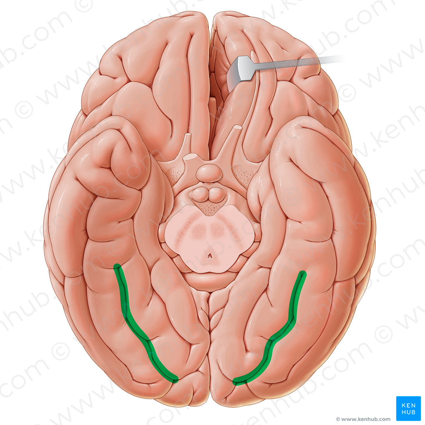 Shown from inferior perspective. Also known as Sagittal sulcus of fusiform gyrus, and Sagittal sulcus of occipitotemporal gyri.