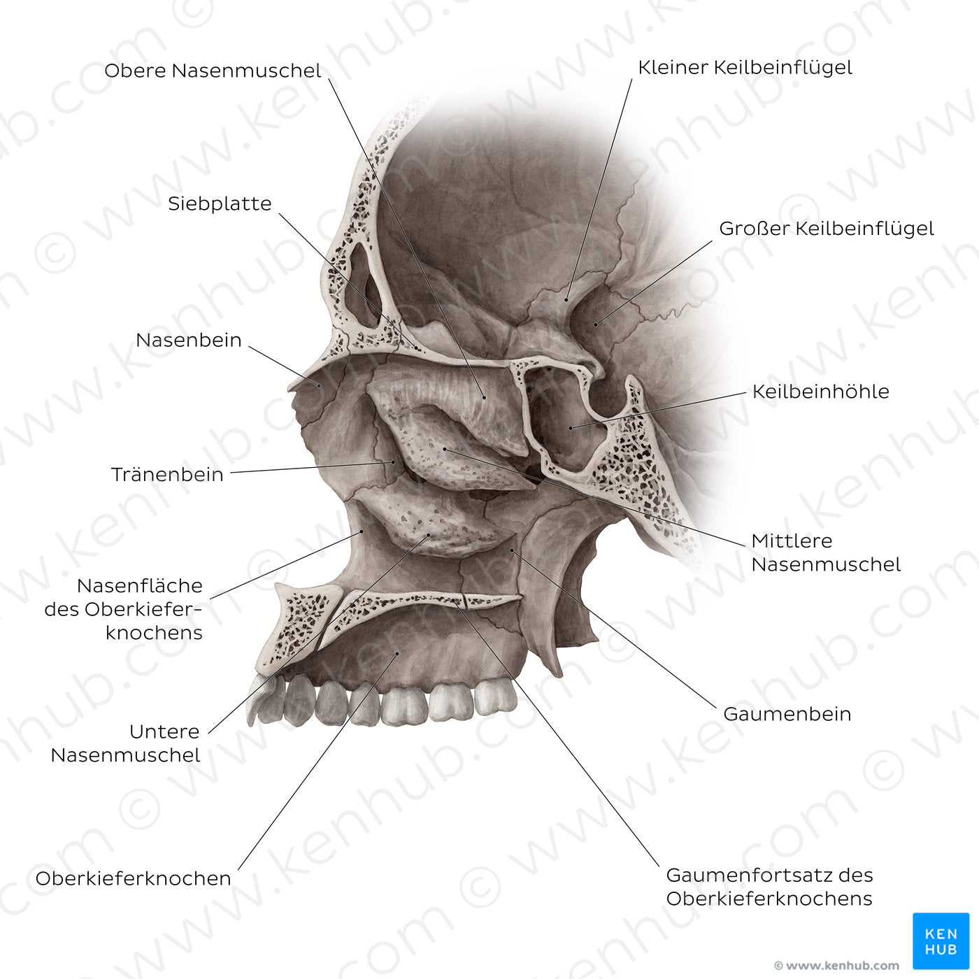 Ein besserer Überblick über die laterale Wand der Nasenhöhle wird mit der entfernten Nasenscheidewand ermöglicht. Die laterale Wand weist drei knöcherne Strukturen auf, die obere, mittlere und untere Nasenmuschel. Die obere und mittlere Nasenmuschel stellen Teile des Siebbeins dar, während die untere Nasenmuschel ein selbstständiger Knochen ist und mit dem Siebbein, Oberkiefer, Tränenbein und Gaumenbein verbunden ist.
