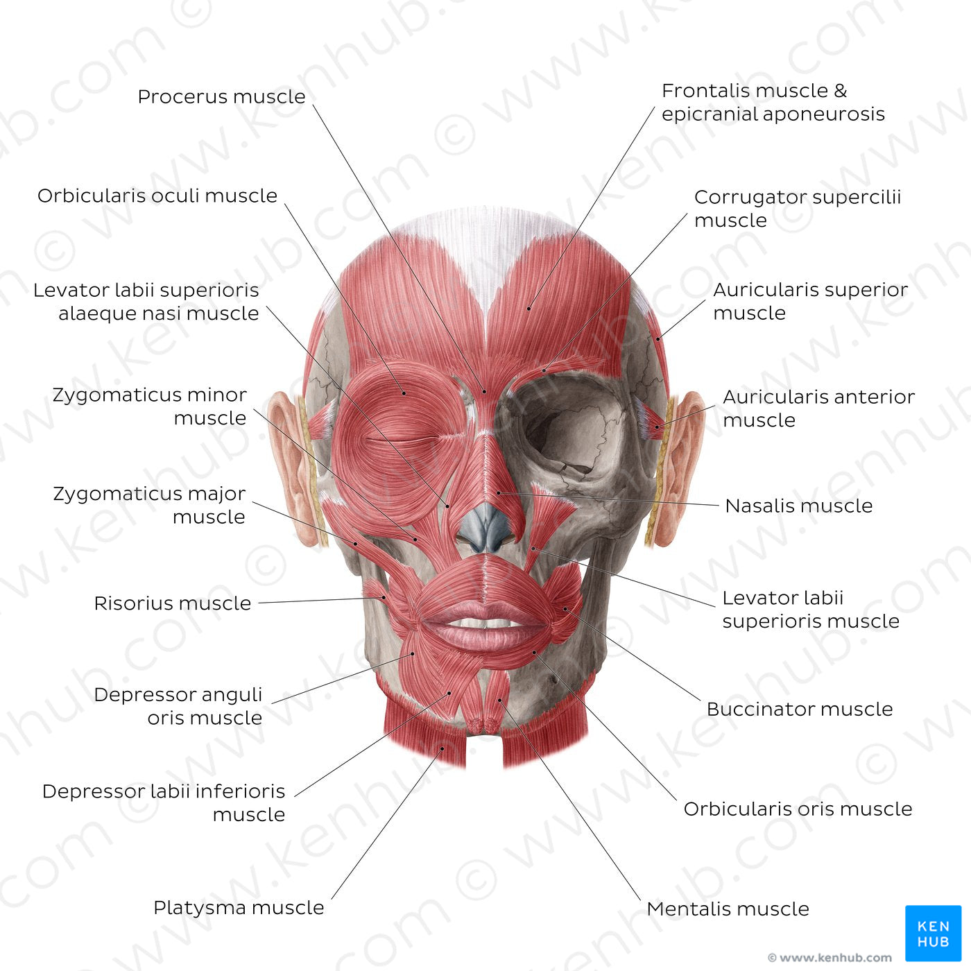 The largest group consisting of 11 muscles is the buccolabial group. The majority of the mouth muscles are connected by a fibromuscular hub (modiolus) at each angle of the mouth into which these muscles insert. This group is in charge of the shape and movements of the mouth and lips. The next group is the nasal group that consists of 2 muscles (nasalis and procerus muscles). Next, the orbital group consists of 3 muscles (orbicularis oculi, corrugator supercilii, depressor supercilii muscles) that are responsible for opening and closing the eyes and moving the eyebrows. The auricular group is a group of 3 fan-shaped muscles (auricularis anterior, auricularis posterior and auricularis superior muscles) that move the ear lobe/auricle to a small extent. The last group is the epicranial group (scalp and neck group) which includes 2 wide and flat muscles (occipitofrontalis and platysma muscles). The occipitofrontalis muscle consists of two bellies (occipital and frontal) and acts mainly on the forehead, while the platysma mainly acts on the neck and lower lip.