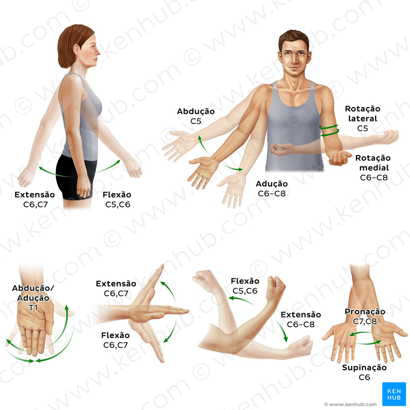 Múltiplos miótomos são responsáveis por gerar a maior parte dos movimentos no membro superior. Abdução, flexão e rotação externa do braço na articulação glenoumeral (ombro) é controlada principalmente por C5, enquanto C6, C7 e C8 são os principais responsáveis pela adução e rotação interna dessa articulação. A flexão do antebraço na articulação do cotovelo é controlada predominantemente por C6, enquanto C7 é o principal miótomo que controla a extensão do antebraço na articulação do cotovelo. A extensão do braço na articulação glenoumeral e a flexão e extensão dos dedos é controlada principalmente por C7 e C8. Na mão, T1 é o único miótomo envolvido na abdução e adução dos dedos indicador, médio e anular. A supinação é feita por C6, enquanto a pronação é feita pelos miótomos C7 e C8.
