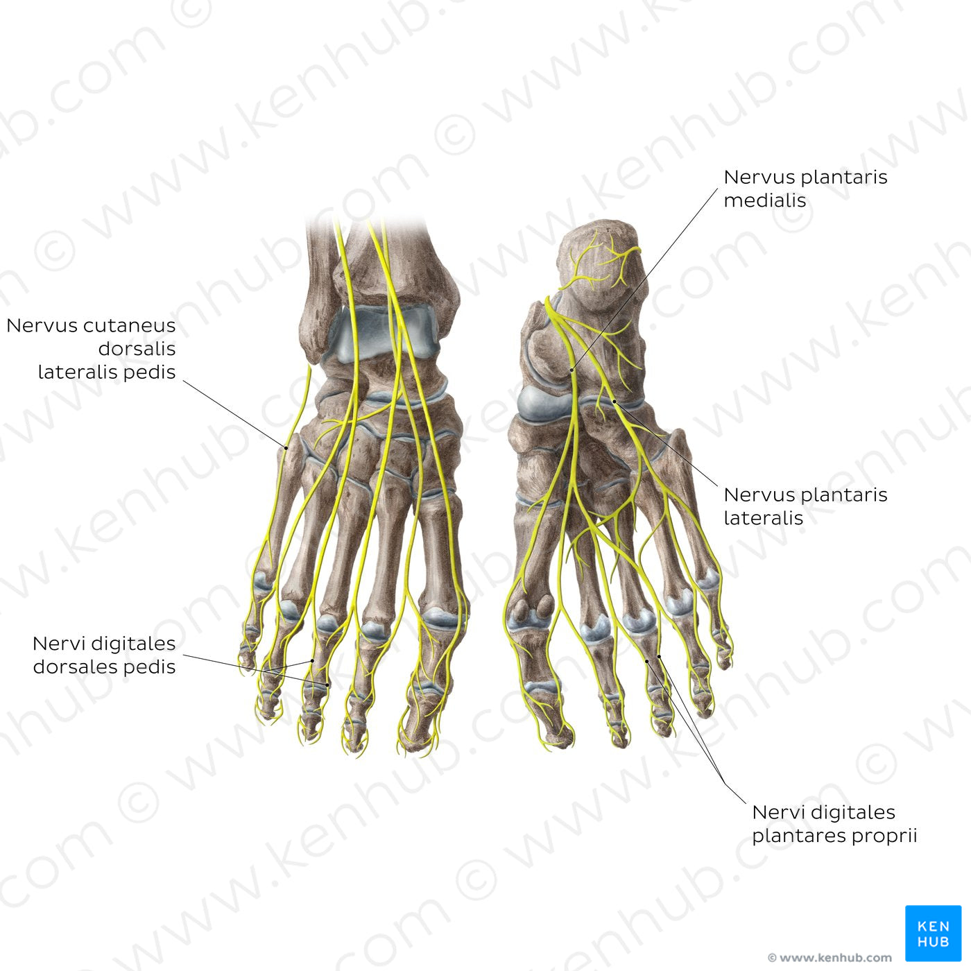 At first glance, the trajectory of the neural network seems similar to the arterial one. The difference is that all these branches come from as many as 5 nerves. Notice how the dorsum of the foot (image on the left) is supplied mainly by the branches of n. fibularis superficialis and profundus, n. tibialis, and n. suralis. The cutaneous innervation of this area is supplied by n. saphenus. Finally, the sole of the foot is mainly innervated by the branches of n. tibialis (nn. plantares medialis et lateralis).