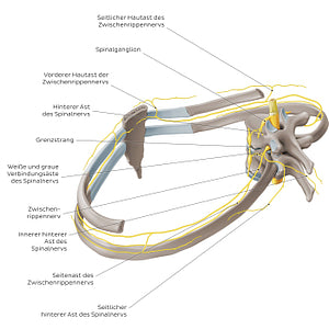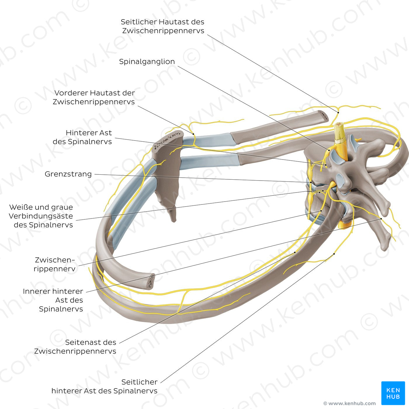 Die Zwischenrippennerven beginnen als die vorderen Ästen der Spinalnerven (T1-T12). Jeder Zwischenrippennerv gibt seitliche Hautäste ab und verläuft nach ventral als vorderer Hautast der Zwischenrippennerven. Neben den Hauptästen gibt es auch Seitenäste der Zwischenrippennerven, die am Oberrand der nächsttieferen Rippe verlaufen.