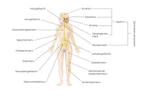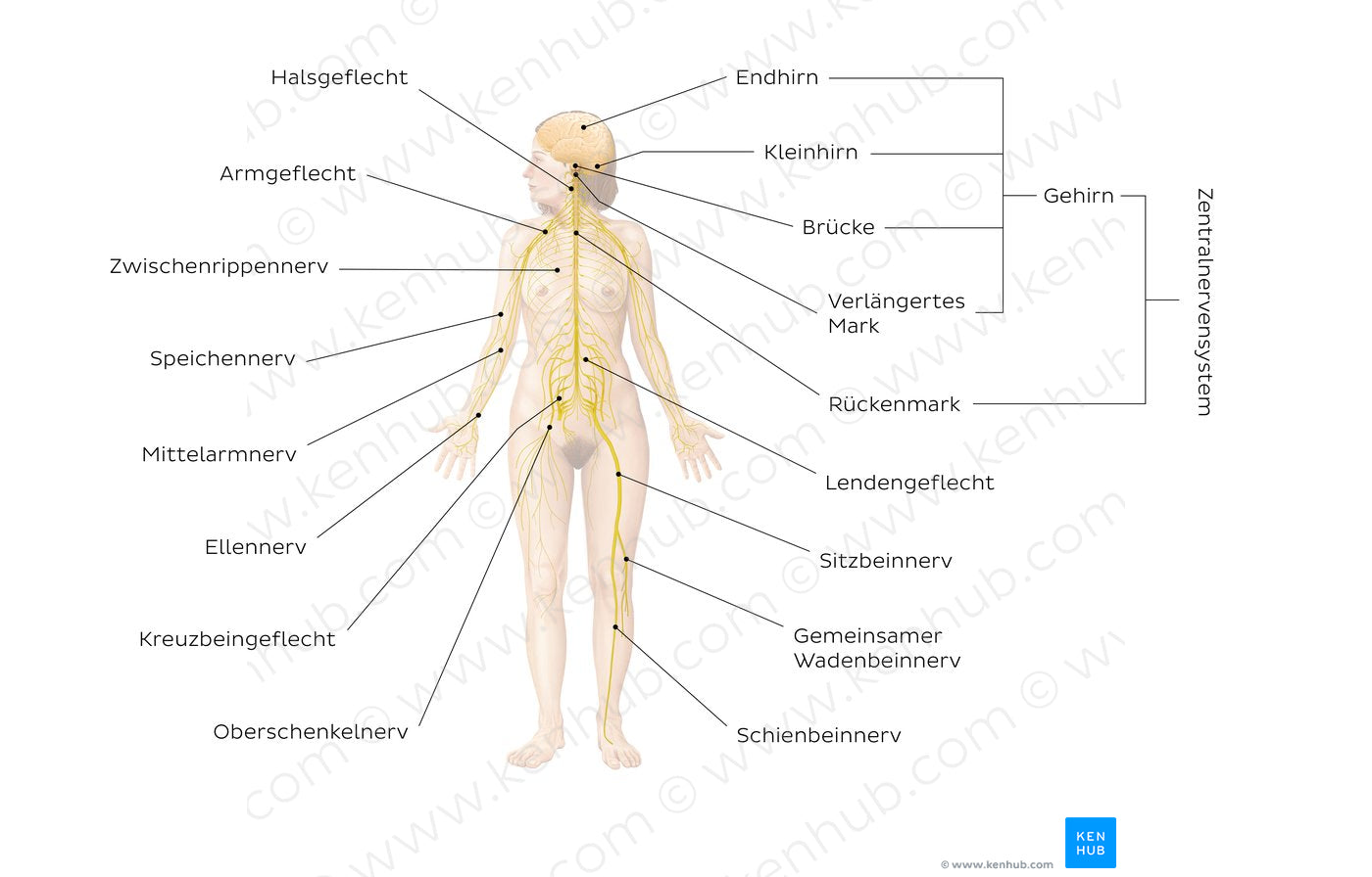 Das Nervensystem wird in das zentrale und das periphere Nervensystem unterteilt. Das Zentralnervensystem (ZNS) besteht aus dem Gehirn und dem Rückenmark, die im Schädel bzw. im Wirbelkanal liegen. Das periphere Nervensystem (PNS) besteht aus den peripheren Nerven, den Nervengeflechten (Plexus) und den peripheren Ganglien.