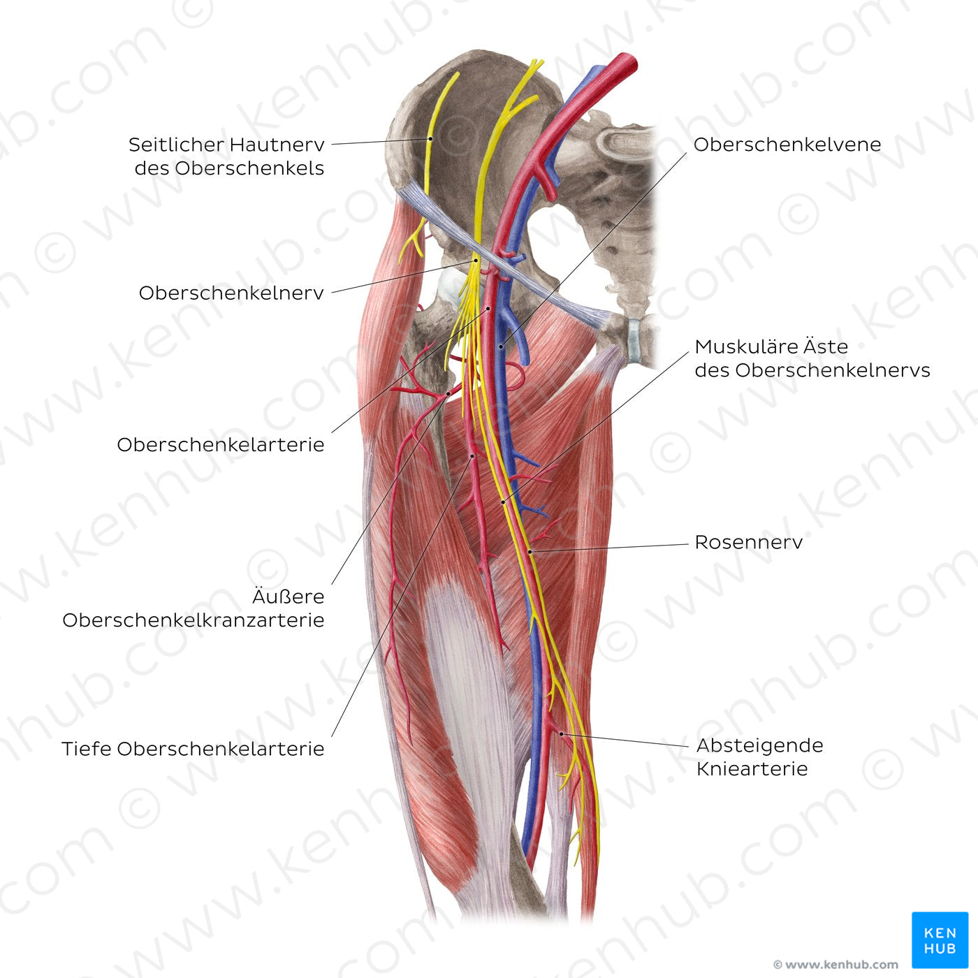 Das wichtigste arterielle Blutgefäß von Hüfte und Oberschenkel ist die Oberschenkelarterie, die unterhalb des Leistenbands als Fortsetzung der äußeren Beckenarterie entsteht und innerhalb des Schenkeldreiecks und im anteromedialen Oberschenkel verläuft. Im distalen Anteil des Oberschenkels verläuft sie durch den Adduktorenkanal und gelangt so in die Fossa poplitea, wo sie Kniekehlenarterie genannt wird. Der Hauptast der Oberschenkelarterie ist die tiefe Oberschenkelarterie. Sie verläuft entlang der Oberschenkelarterie und gibt mehrere kleinere Äste ab, die die Hüftregion (innere/äußere Oberschenkelkranzarterie) und die Muskeln des hinteren und medialen Oberschenkels (Perforansarterien) versorgen. Entlang der Oberschenkelarterie verläuft die Oberschenkelvene, die das Blut der Kniekehlenvene, der großen Rosenvene, der tiefen Oberschenkelvene und ihrer Zuflüsse in der Hüft- und Oberschenkelregion drainiert. Der Oberschenkelnerv verläuft auch entlang der Oberschenkelarterie und innerviert die Muskeln und die Haut der Hüfte und des vorderen Oberschenkels. Der mediale Oberschenkel wird hauptsächlich durch den Hüftlochnerv innerviert.