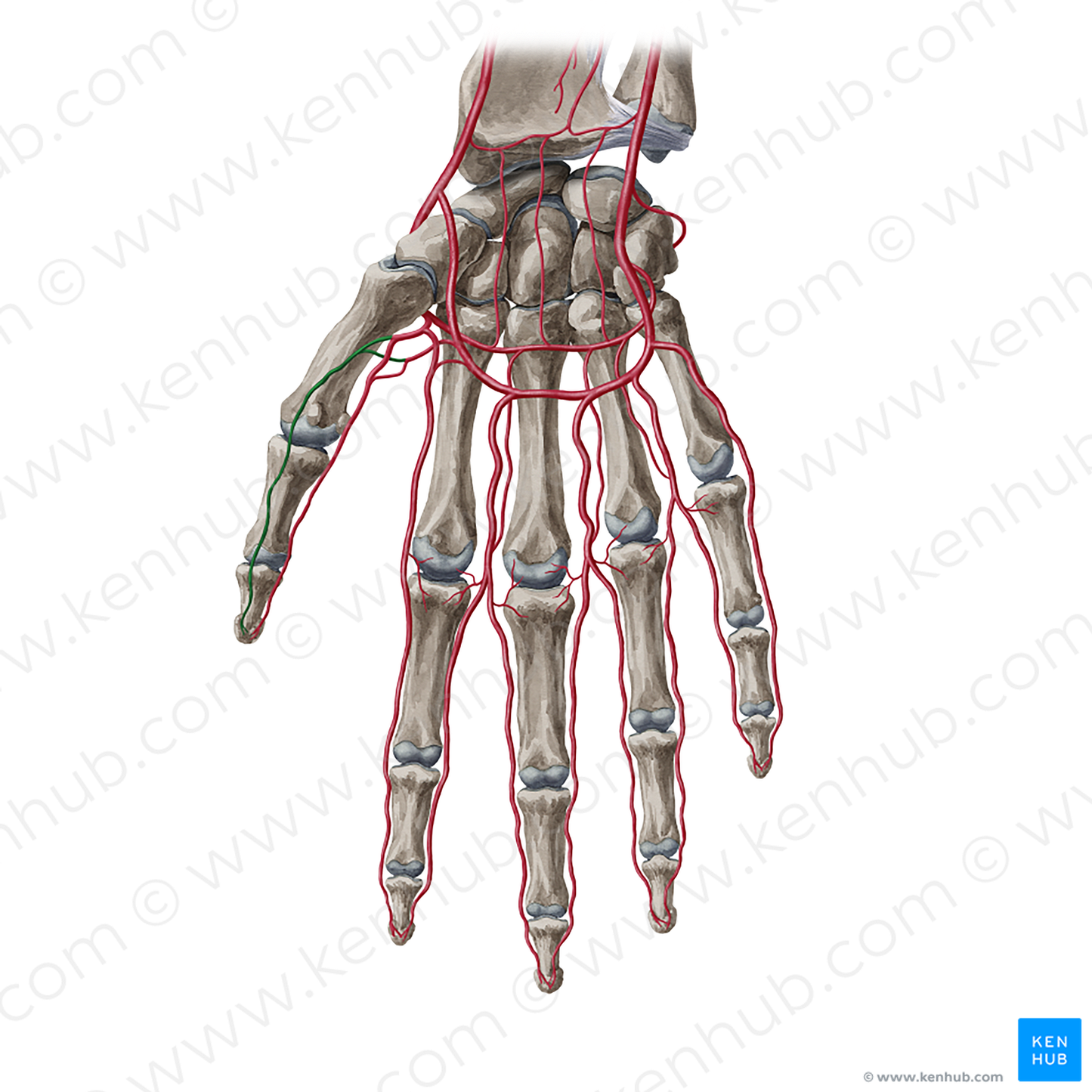 Shown from anterior perspective. Also known as Radiopalmar digital artery of thumb, and Volar radial digital artery of thumb.