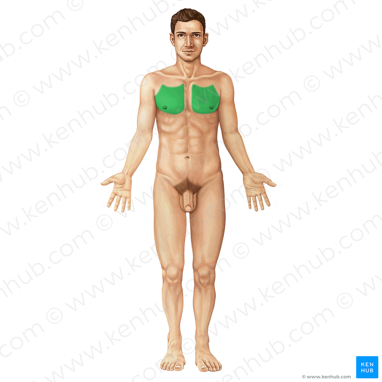 Shown from anterior perspective. Also known as Breast region, and Mammary region.