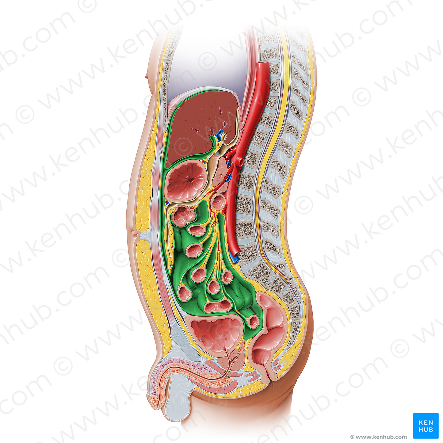 Shown from medial perspective. Also known as General cavity of abdomen, General cavity of peritoneum, Peritoneal cavity proper, and Greater sac.