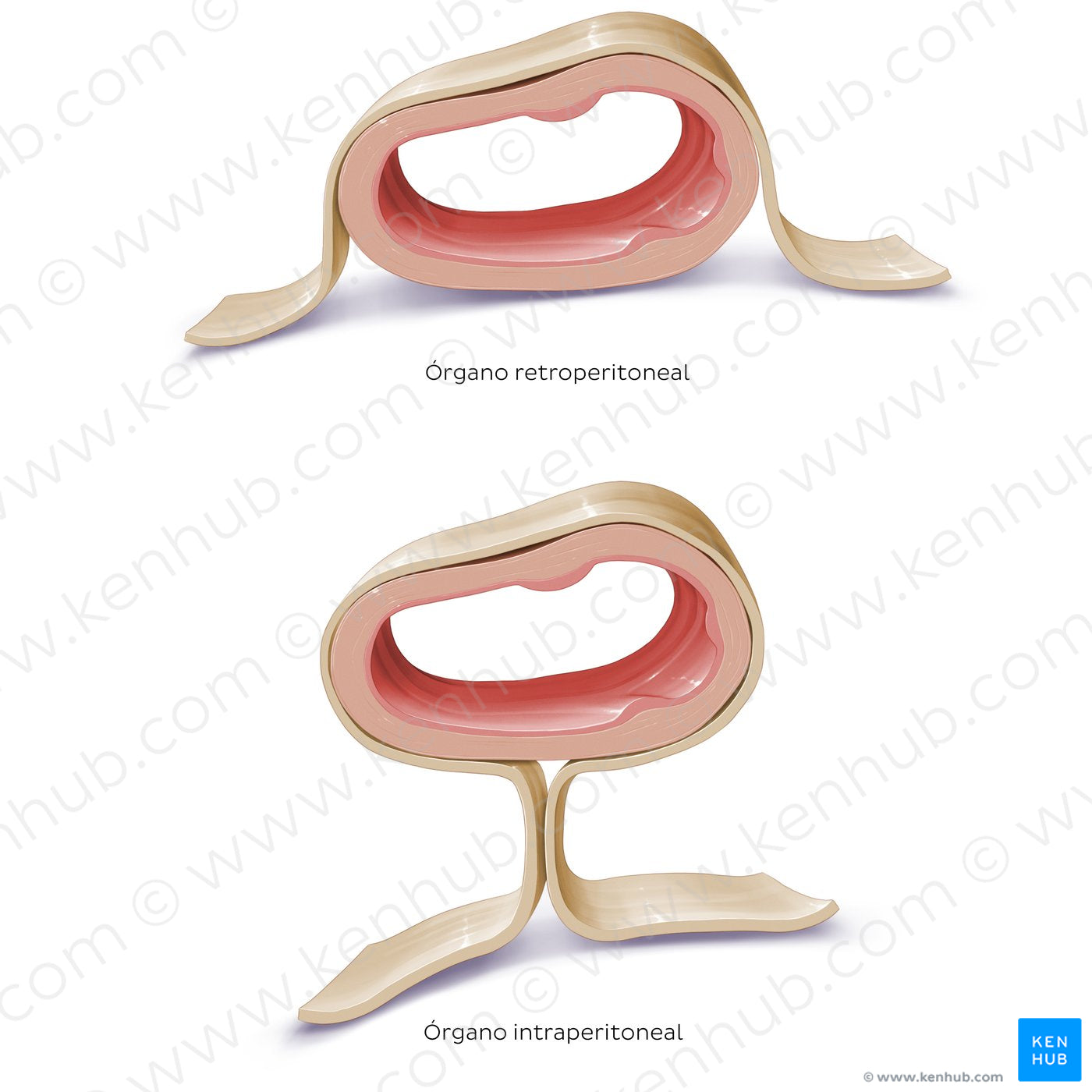 Los órganos que se encuentran completamente rodeados por peritoneo visceral y conectados a través del mesenterio se denominan órganos intraperitoneales. La mayoría de estructuras intraperitoneales se asocian al tracto gastrointestinal ya que esta organización les permite soporte y movimiento a ambos. Al contrario, los órganos ubicados detrás del peritoneo parietal se conocen como órganos retroperitoneales. Si estos se desarrollan y permanecen fuera del peritoneo, se conocen como órganos retroperitoneales primarios. Los órganos retroperitoneales secundarios por su parte, se desarrollan inicialmente dentro del peritoneo y se convierten en retroperitoneales cuando su mesenterio se fusiona con la pared abdominal posterior durante el desarrollo embrionario. Los órganos infraperitoneales son órganos que se ubican inferior a la cavidad peritoneal.