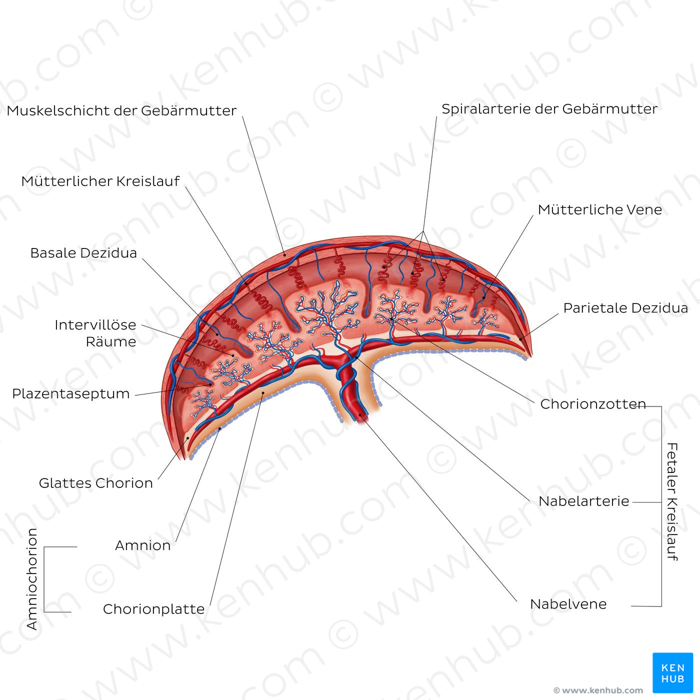 Zu Beginn der Fetalperiode besteht die Plazenta aus zwei Komponenten: einem fetalen Teil, der vom Chorion frondosum gebildet wird, und einem mütterlichen Teil, der von der Decidua basalis gebildet wird. Auf der fetalen Seite wird die Plazenta von der Chorionplatte begrenzt. Auf der mütterlichen Seite wird sie von der Decidua basalis begrenzt. In der Plazenta treffen zwei Kreislaufsysteme aufeinander: der fetale Kreislauf und der mütterliche Kreislauf. Die mütterliche Komponente der Plazenta enthält mütterliche Arterien und mütterliche Venen, die in die intervillösen Räume münden. Auf der gegenüberliegenden Seite bilden die Arterien und Venen der Nabelschnur eine baumartige Struktur innerhalb des intervillösen Raums. Hier kommen das fetale und das mütterliche Blut in engen Kontakt, getrennt nur durch eine dünne Membran, die so genannte Plazentamembran.