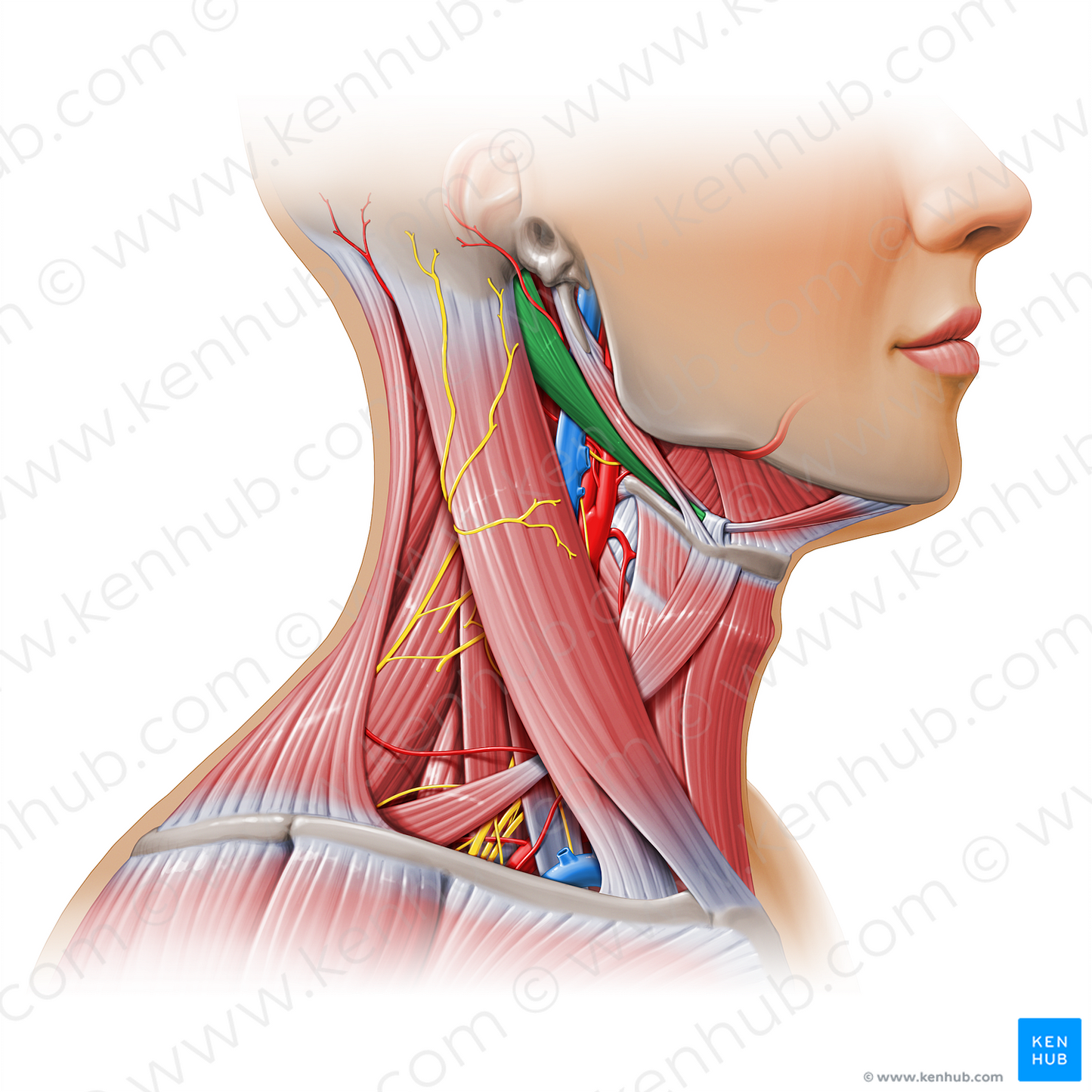 Shown from lateral right perspective. Also known as Mastoid belly of digastric muscle.