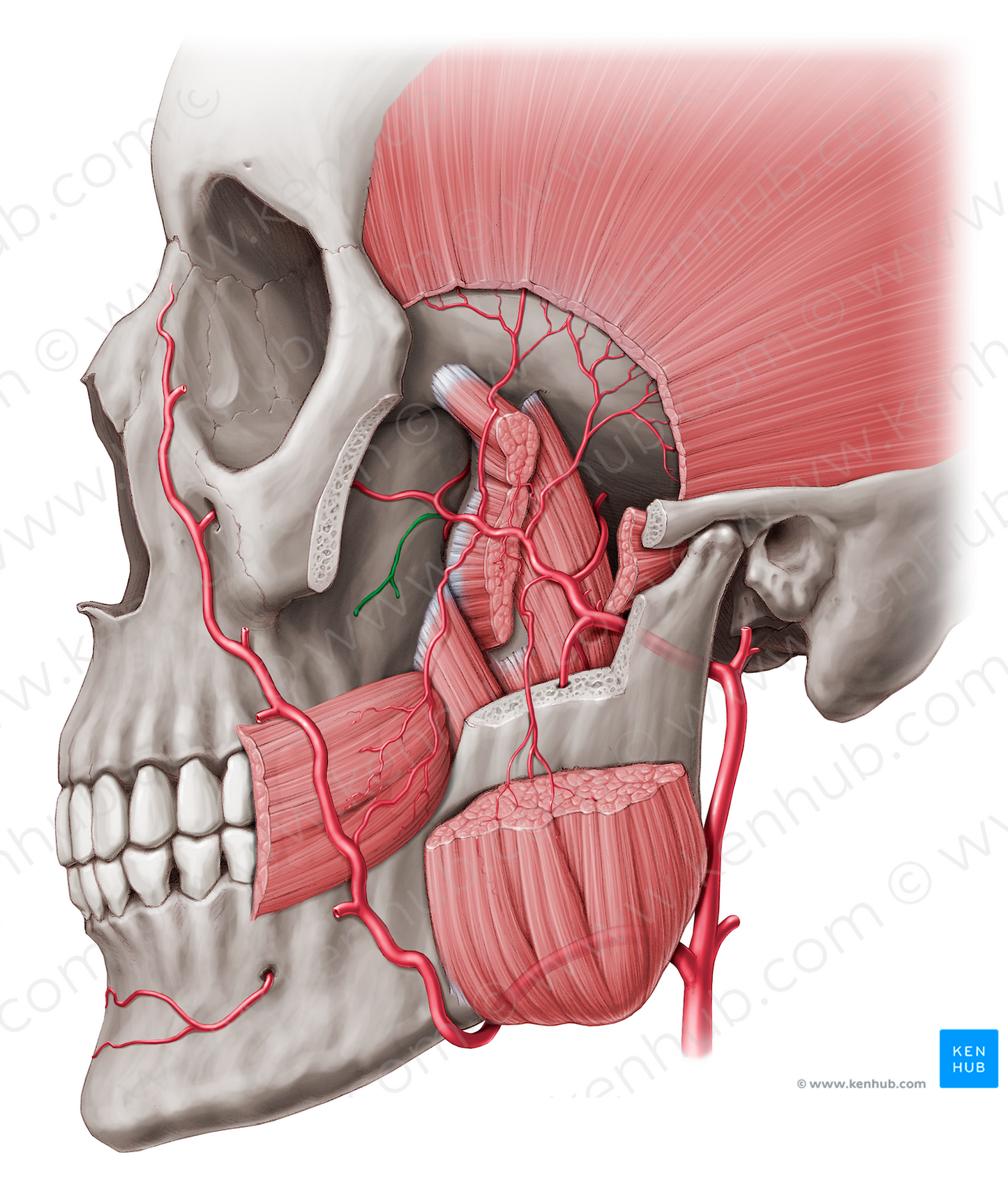 Shown from lateral left perspective. Also known as Posterior superior dental artery, and Posterior maxillary alveolar artery.