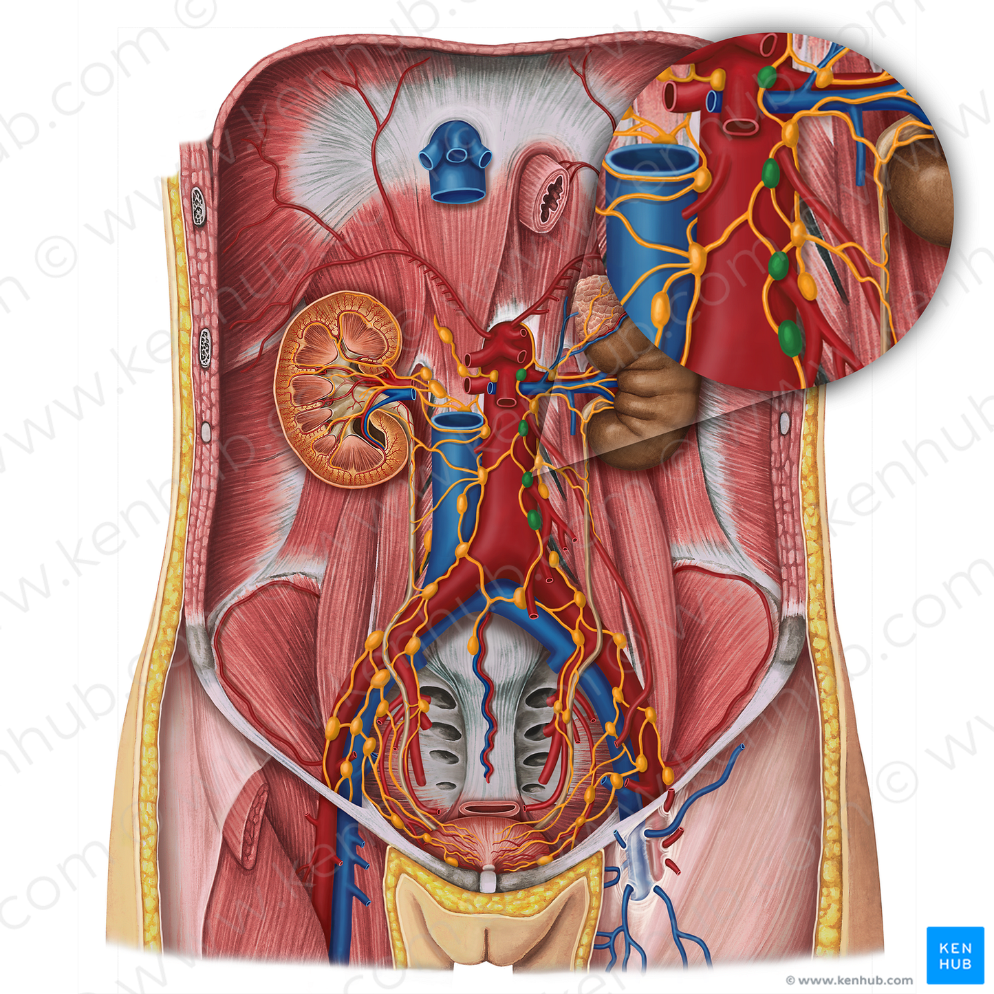 Shown from anterior perspective. Also known as Pre-aortic lymph nodes.