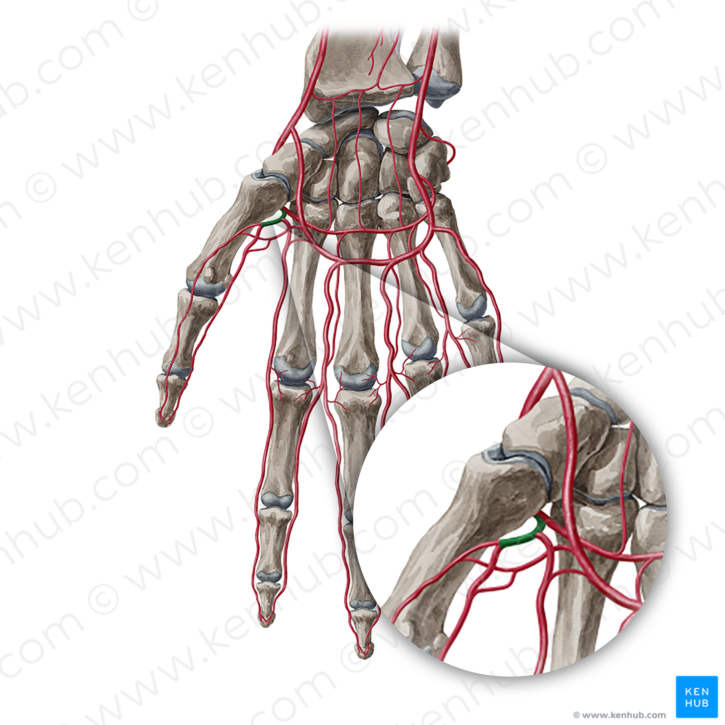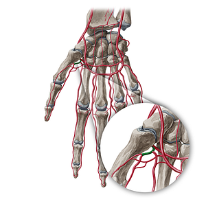 Shown from anterior perspective. Also known as 1st palmar metacarpal artery, and Principal artery of thumb.
