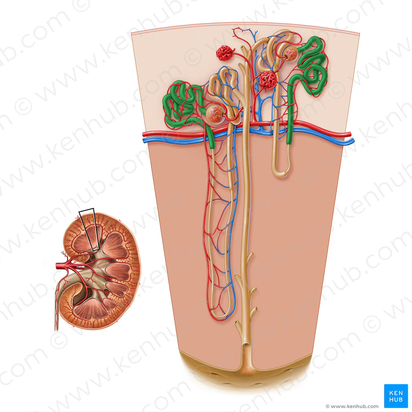 Shown from coronal perspective. Also known as Proximal tubule of renal tubule, and Proximal tubule of nephron.