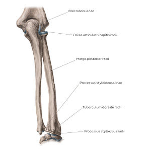 Posteriorly, the margines interossea et posterior radii can be identified. The margo interossea radii forms the radial attachment point for the membrana interossea of the forearm, that spans the space between the radius and ulna. The tuberculum dorsale protrudes on the posterior aspect of the caput radii and is seated between the grooves for the tendons of the mm. extensor carpi radialis longus and brevis, as well as the tendon of the mm. extensor pollicis longus. The processus styloideus radii can also be identified from this posterior view. From a posterior aspect, the ulna is rounded and smooth and can be palpated subcutaneously along the entire length of the medial antebrachial region. The proximal end of the posterior ulna presents a hook-shaped process known as the olecranon. This bony protrusion serves as a short lever for extension of the elbow. The margines interossea et posterior ulnae can also be appreciated from this view.