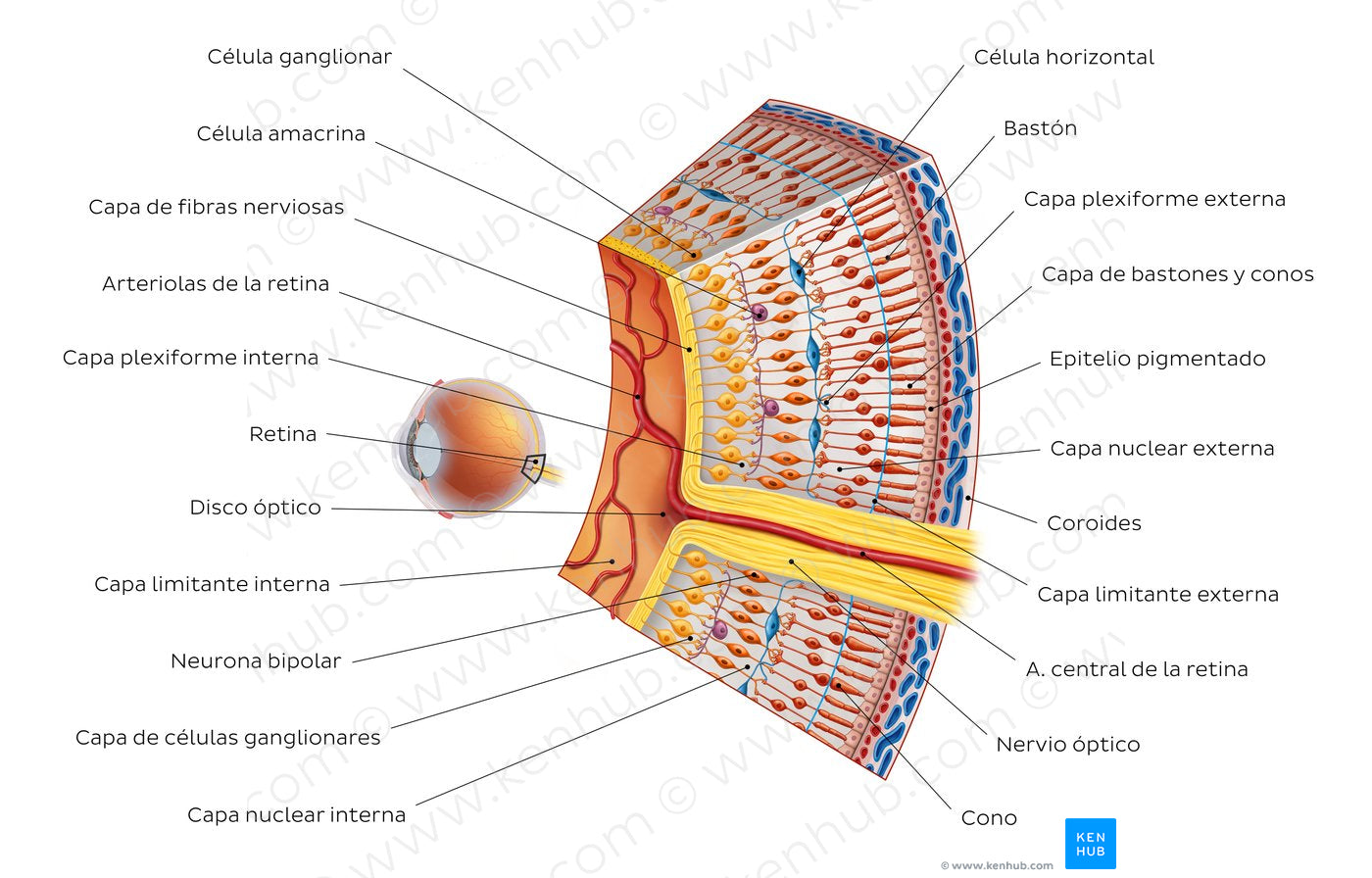 Histológicamente, la retina puede dividirse en 10 capas. Desde profundo hacia superficial, estas son: membrana limitante interna, capa de fibras nerviosas, capa de células ganglionares, capa plexiforme interna, capa nuclear interna, capa plexiforme externa, capa nuclear externa, membrana limitante externa y epitelio pigmentario de la retina.